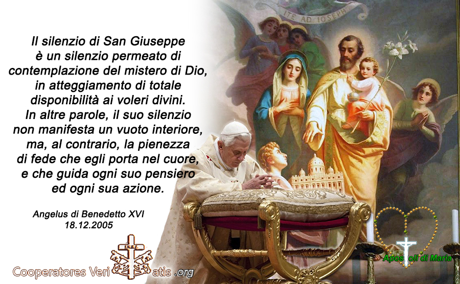 Lasciamoci “contagiare” dal silenzio di san Giuseppe! Ne abbiamo tanto bisogno, in un mondo spesso troppo rumoroso, che non favorisce il raccoglimento e l’ascolto della voce di Dio. In questo tempo di preparazione al Natale coltiviamo il raccoglimento interiore, per accogliere e custodire Gesù nella nostra vita. (Angelus Benedetto XVI 18.12.2005)