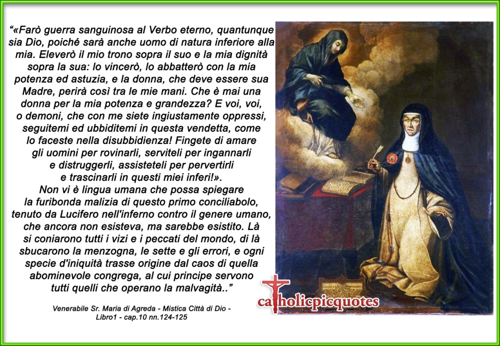 7. A queste parole era presente la Regina stessa, la quale non si sdegnò affatto di assumere un simile incarico che sua divina Maestà le assegnava. Al contrario, accettandolo benignamente, disse: «Figlia mia, voglio che tu sia mia discepola e compagna ed io sarò tua maestra; ma sappi che mi devi obbedire con fortezza e da oggi in poi non deve restare più in te traccia del tuo essere figlia di Adamo. La mia vita, le opere del mio pellegrinaggio e le meraviglie che il braccio onnipotente dell’Altissimo ha operato con me devono essere tuo specchio e regola della tua vita». Io mi prostrai dinanzi al trono regale del Re e della Regina dell’universo offrendomi di obbedire in tutto e resi grazie al sovrano Signore per il beneficio tanto superiore ai miei meriti che mi concedeva dandomi un tale patrocinio e una tale guida. Nelle mani della Vergine rinnovai i voti della mia professione offrendomi nuovamente di obbedirle e di cooperare con tutte le mie forze all’emendazione della mia vita. Allora mi disse il Signore: «Fai attenzione e guarda». Io lo feci e vidi una scala di molti gradini, bellissima, con un numero grande di angeli che la circondavano e altri che per essa salivano e discendevano. E sua Maestà mi disse: «Questa è la misteriosa scala di Giacobbe, che è casa di Dio e porta del cielo. Se tu ti preparerai e la tua vita sarà tale che i miei occhi non vi trovino nulla da riprendere, tu per essa salirai a me» (dalla Mistica Città di Dio Libro 1 cap.1).