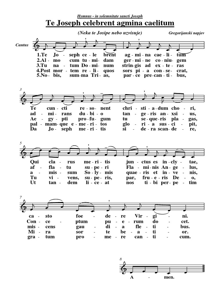Inno attribuito a Gersone (+ 1429) grande apostolo della direzione a S. Giuseppe – a Papa Clemente X che l’inserirà nel breviario – al Card. Bona – e – quasi certamente del P. Giovanni della Concezione carmelitano spagnolo (1665). Per interessamento di Suor Chiara (Vittoria Colonna), Carmelitana, fu introdotto nel Breviario (1671). Analisi: Sposalizio (Str. 1) – rivelazione del mistero dell’Incarnazione (Str. 2) – Natale, Fuga, Smarrimento (Str. 3) – Gioie di Nazareth (Str. 4) – Lode e Gloria alla Santissima Trinità (Str. 5). Meravigliosamente cantato dal Coro “Santa Veronica” Parrocchia di santa Maria Nascente in Bonemerse (CR) dedicato oggi a “Don Natale Bellani”.