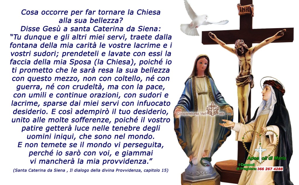 QUELLE “SANTE” RACCOMANDAZIONI… dal Dialogo…. Dice santa Caterina nel Dialogo: “Venne poi il Verbo, che prese in mano questa chiave dell’obbedienza e la purificò nel fuoco ardente della divina carità, la trasse dal fango lavandola con il Suo Sangue, la raddrizzò col coltello della giustizia, distruggendo le nostre iniquità sull’incudine del Suo Corpo Crocefisso. Egli così la racconciò per donarla a noi, ed è così resa perfetta che per quanto l’uomo la guasti con il suo libero arbitrio, Egli con altrettanto libero arbitrio, sempre la riacconcia…”