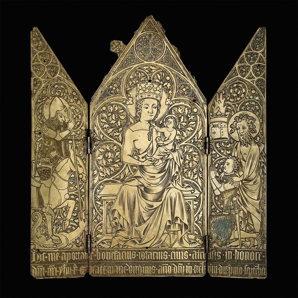 Interamente inciso con il bulino, il Trittico del Rocciamelone è composto da tre parti terminanti a cuspide, unite da quattro cerniere: a quella centrale, più grande, sono collegate due più piccole a forma di trapezio, che fungono da sportelli, in maniera da rendere più comodo il trasporto. Sulla tavola centrale è rappresentata la Madonna seduta su un trono a cassapanca mentre tiene in braccio il piccolo Gesù, che in una mano regge una sfera, simbolo del mondo, e con l’altra accarezza il mento della madre. Entrambi hanno il capo circondato da un’aureola.
