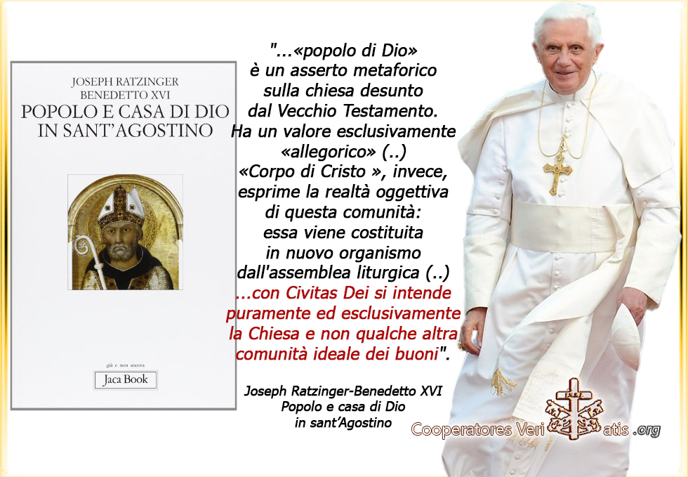 “La crescita sproporzionata di singoli elementi culturali più rispondenti alla coscienza comune ha portato, quindi, negli anni seguenti il concilio, al quasi totale soffocamento dell’aspetto cristologico nella comprensione della Chiesa. È prevalsa una banalizzazione del concetto di popolo di Dio, opporsi alla quale può sembrare oggi pressoché impossibile.” (Popolo e casa di Dio in Sant’Agostino di Joseph Ratzinger)