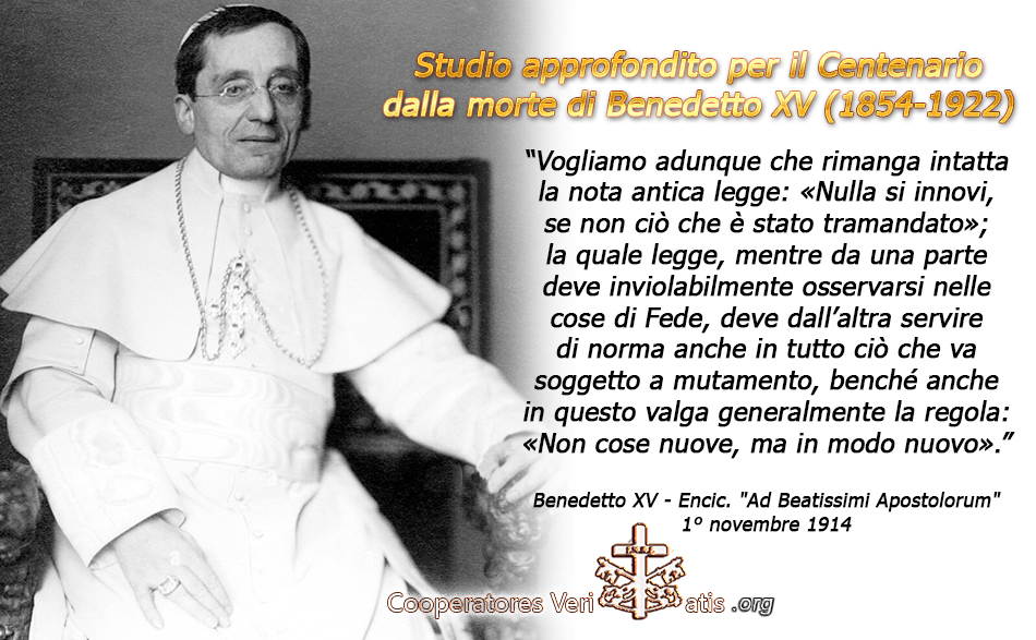 Ci fermiamo qui… perché tutto il resto lo troverete nel pdf che vi offriamo per ricordare il vero insegnamento della Chiesa. Benedetto XV ha combattuto, col suo insegnamento, non soltanto lo “spargimento di sangue” fraterno a causa della guerra, ma soprattutto ha combattuto contro la “morte delle anime”, contro l’apostasia, il Modernismo, l’eresia; ha combattuto contro la corruzione dei governi e delle nazioni, contro le idee perverse che già minavano l’Europa Cristiana. Ha fatto sì delle “aperture” ma specificando, appunto: “Vogliamo adunque che rimanga intatta la nota antica legge: «Nulla si innovi, se non ciò che è stato tramandato»; la quale legge, mentre da una parte deve inviolabilmente osservarsi nelle cose di Fede, deve dall’altra servire di norma anche in tutto ciò che va soggetto a mutamento, benché anche in questo valga generalmente la regola: «Non cose nuove, ma in modo nuovo».”