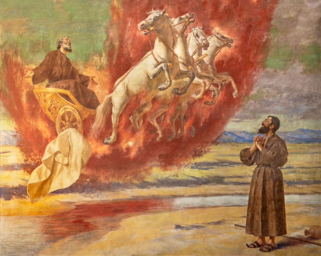 Mentre camminavano conversando, ecco un carro di fuoco e cavalli di fuoco si interposero fra loro due. Elia salì nel turbine verso il cielo. Eliseo guardava e gridava. «Padre mio, padre mio, cocchio d’Israele e suo cocchiere». E non lo vide più. allora afferrò le proprie vesti e le lacerò in due pezzi. quindi raccolse il mantello, che era caduto ad Elia, e tornò indietro, fermandosi sulla riva del Giordano. Prese il mantello che era caduto ad Elia, e colpì con esso le acque dicendo: «Dov’è il Signore Dio di Elia?» Quando ebbe percosso le acque, queste si separarono di qua e di là; così Eliseo passò dall’altra parte. Vistolo da una certa distanza, i figli dei profeti di Gerico dissero: «Lo spirito di Elia si è posato su Eliseo» (2 Re 2, 8-15).