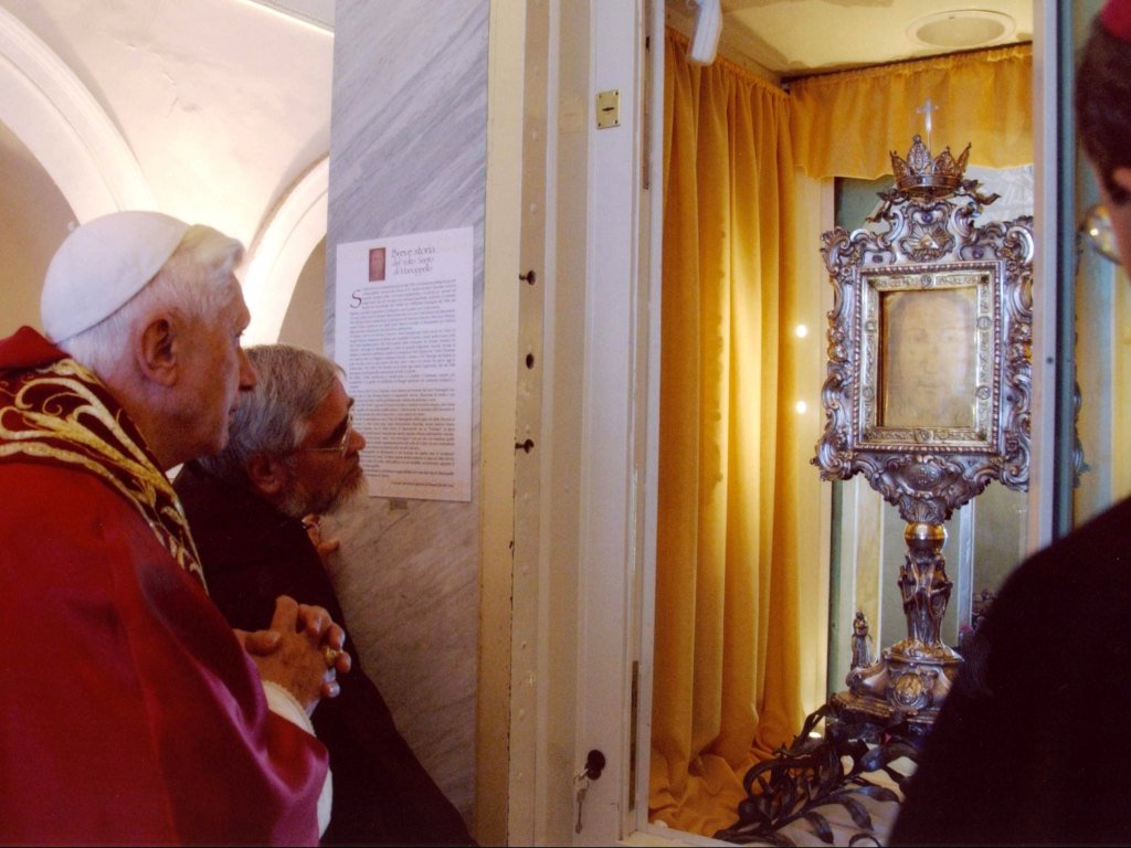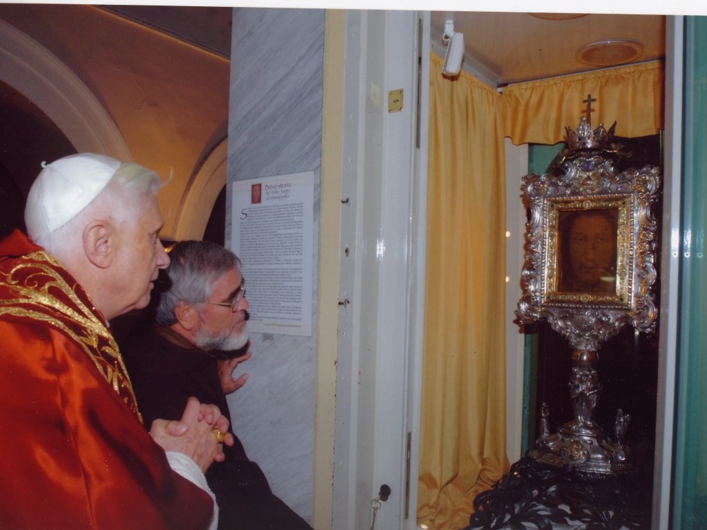 Benedetto XVI con padre Carmine Cucinelli davanti al Volto Santo di Manoppello