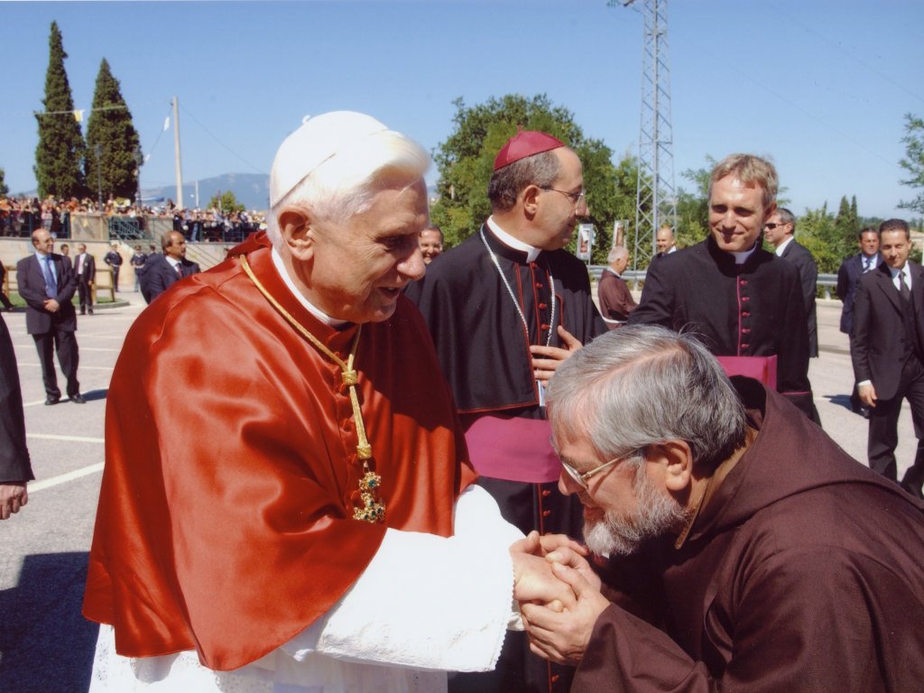 Anzitutto devo ancora una volta dire un grazie dalla profondità del cuore per questa accoglienza, per le sue parole, Eccellenza, così profonde, così amichevoli, per l’espressione della sua amicizia, della vostra amicizia, e per i doni di grandissimo significato: il Volto di Cristo qui venerato, per me, per la mia casa, e poi questi doni della vostra terra, che esprimono la bellezza e la bontà della terra, degli uomini che qui vivono e lavorano, e la bellezza e la bontà del Creatore stesso. Vorrei semplicemente ringraziare il Signore per l’odierno incontro, semplice e familiare, in un luogo dove possiamo meditare sul mistero dell’amore divino contemplando un’icona del Volto Santo. A voi tutti qui presenti va il mio grazie più sentito per la vostra cordiale accoglienza e per l’impegno e la discrezione con cui avete favorito questo mio privato pellegrinaggio. Saluto e ringrazio in particolare il vostro Arcivescovo che si è fatto interprete dei comuni sentimenti. Grazie per i doni che mi avete offerto e che apprezzo molto proprio nella loro qualità di “segni”. Sono segni, infatti, della comunione affettiva ed effettiva che lega il popolo di questa cara terra d’Abruzzo al Successore di Pietro. Un saluto speciale rivolgo a voi, sacerdoti, religiosi e religiose e seminaristi qui convenuti. Non essendo possibile incontrare l’intera Comunità diocesana, sono contento che a rappresentarla ci siate voi, persone già dedite al ministero presbiterale e alla vita consacrata o incamminate verso il sacerdozio. Persone che mi piace considerare innamorate di Cristo, attratte da Lui e impegnate a fare della propria esistenza una continua ricerca del suo Santo Volto. Un grato pensiero rivolgo infine alla comunità dei Padri Cappuccini, che ci ospita, e che da secoli si prende cura di questo santuario, meta di tanti pellegrini.