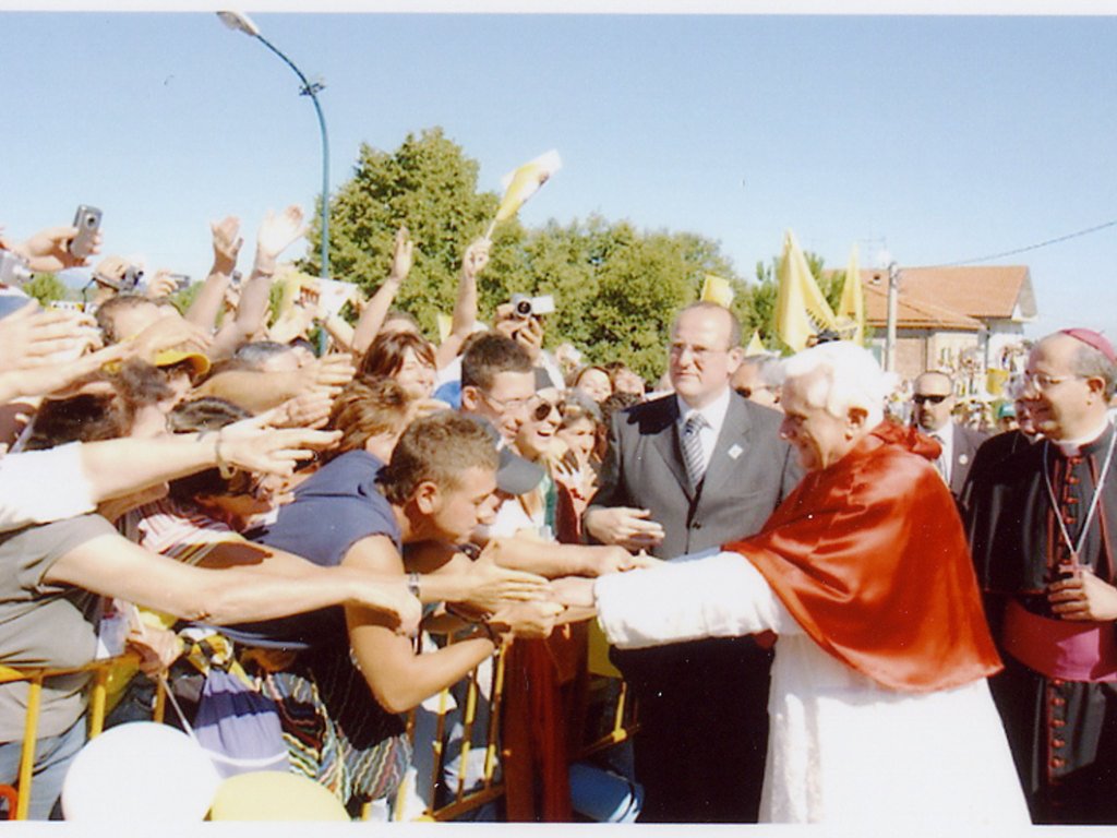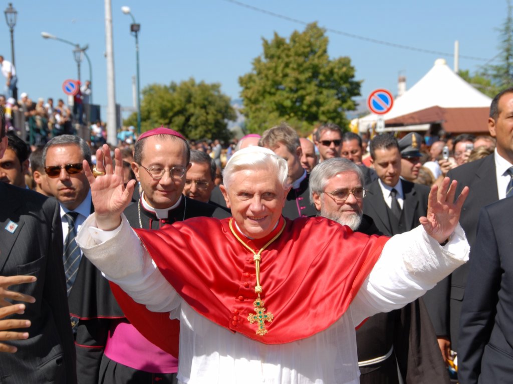 “Jesu… quam bonus te quaerentibus! – Quanto sei buono, Gesù, per chi ti cerca!”: così avete cantato poco fa eseguendo l’antico inno “Jesu, dulcis memoria“, che qualcuno attribuisce a San Bernardo. E’ un inno che acquista singolare eloquenza in questo santuario dedicato al Volto Santo e che richiama alla mente il Salmo 23(24): “Ecco la generazione che lo cerca, che cerca il tuo volto, Dio di Giacobbe” (v. 6). Ma quale è “la generazione” che cerca il volto di Dio, quale generazione è degna di “salire il monte del Signore”, di “stare nel suo luogo santo”? Spiega il salmista: sono coloro che hanno “mani innocenti e cuore puro”, che non pronunciano menzogna, che non giurano a danno del loro prossimo (cfr vv. 3-4). Dunque, per entrare in comunione con Cristo e contemplarne il volto, per riconoscere il volto del Signore in quello dei fratelli e nelle vicende di ogni giorno, sono necessarie “mani innocenti e cuori puri”. Mani innocenti, cioè esistenze illuminate dalla verità dell’amore che vince l’indifferenza, il dubbio, la menzogna e l’egoismo; ed inoltre sono necessari cuori puri, cuori rapiti dalla bellezza divina, come dice la piccola Teresa di Lisieux nella sua preghiera al Volto Santo, cuori che portano impresso il volto di Cristo.