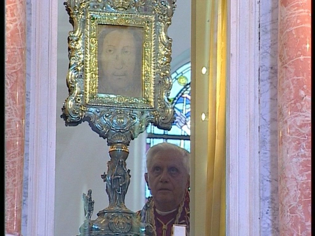È l’acuta osservazione di padre Pfeiffer, che dice: «Io sono convinto che molti dei suoi predecessori hanno già visto la stessa immagine, quando questo stesso Volto Santo veniva chiamato ancora la “Veronica”, collegandolo alla tradizione leggendaria e alla devozione popolare di una donna pia dello stesso nome che avrebbe asciugato il viso di Cristo durante il suo cammino al Calvario. È di enorme e benefico significato che l’attuale Papa abbia visto e contemplato a lungo con i propri occhi questa immagine di Cristo che fu venerata nei secoli come la reliquia più importante della cristianità. […] Oltre alla gioia dell’incontro con il popolo di Manoppello e di tutta la regione dell’Abruzzo, la lunga sosta di Benedetto XVI davanti all’immagine-reliquia è stato il gesto più eloquente della sua visita. Il Papa era visibilmente toccato ed è rimasto in un grande silenzio davanti all’immagine di Cristo, come in un incontro diretto con Gesù, reso possibile attraverso il Volto Santo».