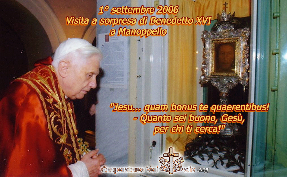 “Noi tutti, come dicono i Salmi, “cerchiamo il Volto del Signore”. E questo è il senso anche di questa mia visita. Insieme cerchiamo di conoscere sempre meglio il volto del Signore e dal volto del Signore attingiamo questa forza di amore e di pace che ci mostra anche la strada della nostra vita..” (Benedetto XVI – Saluto ai Pellegrini a Manoppello, 1° settembre 2006)