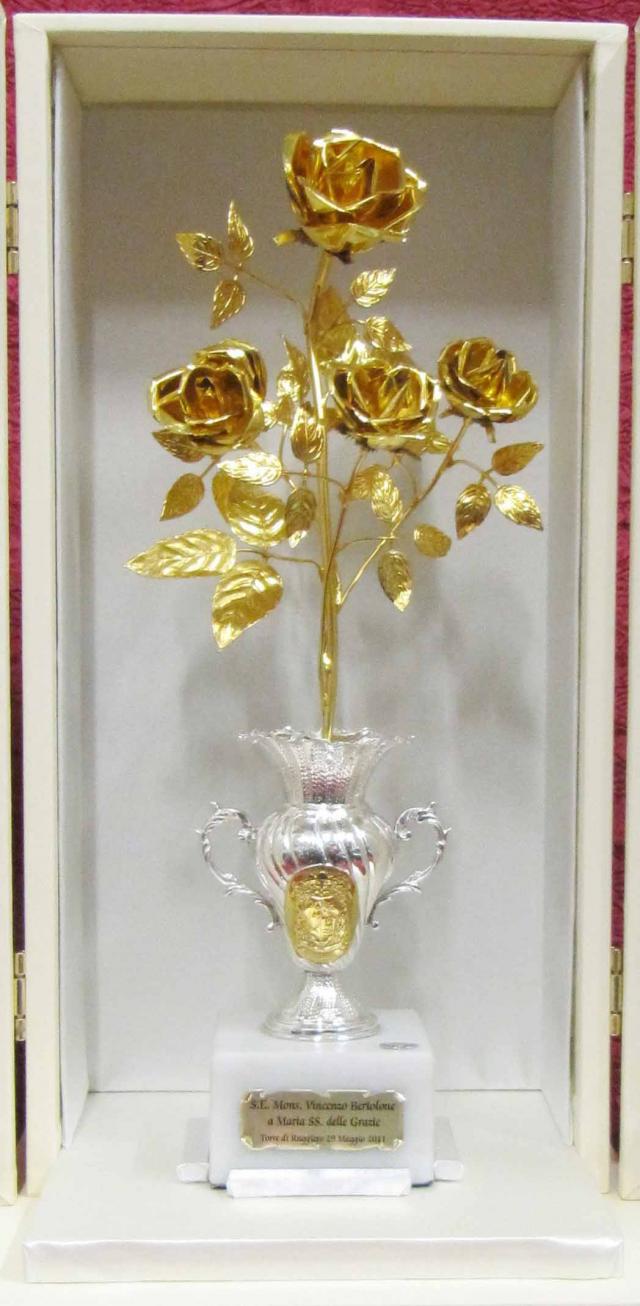 L’uso, da parte dei Papi, di concedere in dono la rosa d’oro s’è perpetuato fino all’epoca moderna, anche se quasi tutti gli antichi esemplari sono andati perduti: si conosce la forma di quella che Innocenzo IV donò ai canonici di San Giusto di Lione grazie a un disegno settecentesco, mentre la più antica tra quelle superstiti — un tempo della cattedrale di Basilea e oggi a Parigi, al Musée de Cluny – è trecentesca. Il cardinale domenicano Vincenzo Maria Orsini, il quale fu per trentott’anni arcivescovo di Benevento e che anche dopo essere assurto al trono di Pietro con il nome di Benedetto XIII (1724-1730) mantenne il titolo di arcivescovo del capoluogo sannita, nell’anno santo del 1725 donò la rosa d’oro a quella chiesa cattedrale: «Aggiungerò — scriveva Moroni nel suo Dizionario — che tuttora si conserva nel suo tesoro, visitato da Pio IX nel 1849». Ebbene, la bella notizia è che nonostante lo scempio perpetrato nell’ultimo conflitto mondiale, quando i bombardieri statunitensi — i quali fecero in città tremila vittime — rasero al suolo l’antica basilica, il gioiello è sopravvissuto, con qualche danno, fino ai nostri giorni e tuttora è visibile al pubblico nel locale Museo diocesano. (fonte)
