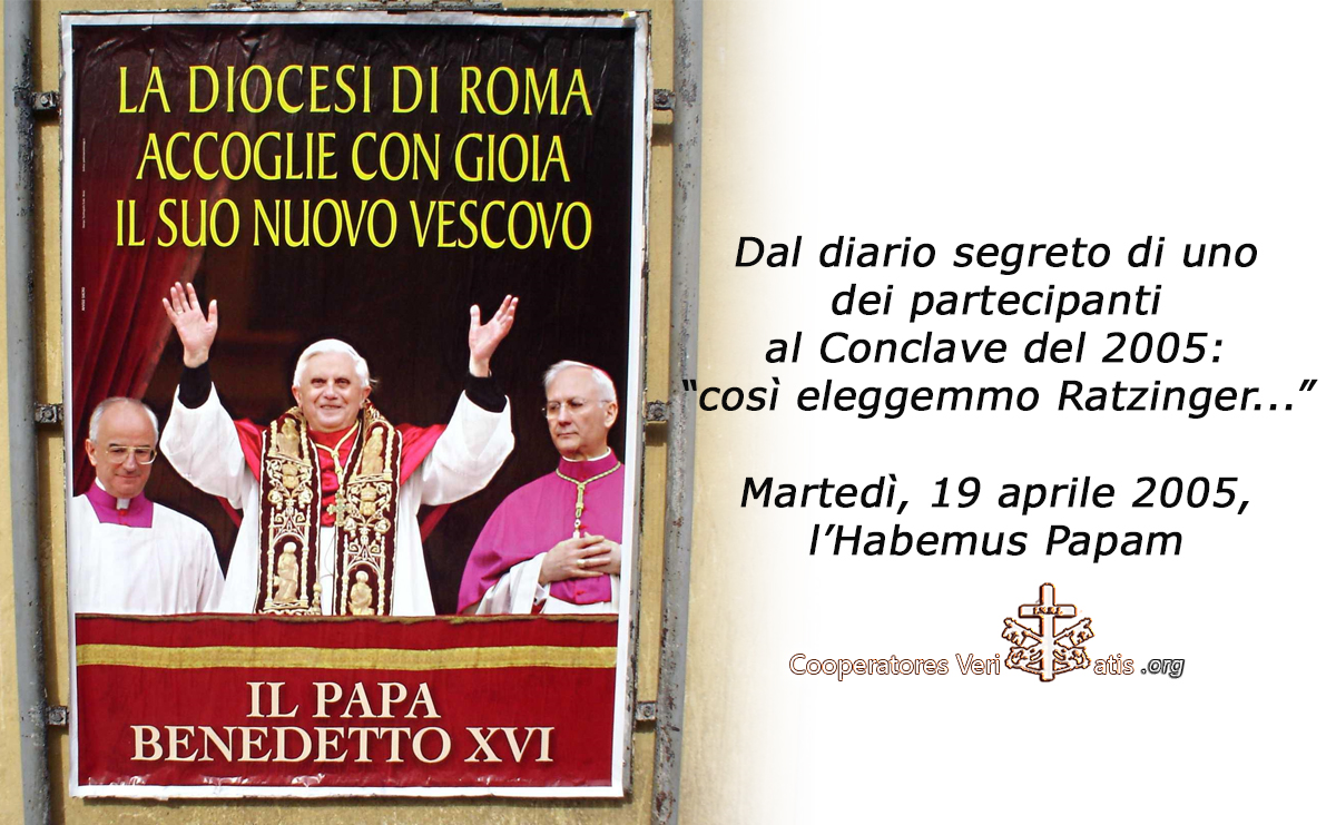 «Lunedì 18 aprile, ore 16,33. La lenta processione dei cardinali dall’Aula delle Benedizioni inizia a muoversi verso la Cappella Sistina; attraversa la Sala Regia, al canto delle litanie dei santi. Pochi minuti ed eccoci al cospetto del Giudizio di Michelangelo. I 115 cardinali – il più affollato conclave della storia moderna! – si dispongono nei sei grandi tavoli sistemati ai lati della cappella. Intoniamo il Veni Creator Spiritus, l’emozione è palpabile ». Il cardinale decano, Joseph Ratzinger, pronuncia a nome di tutti la solenne formula del giuramento: «Noi tutti e singoli Cardinali elettori presenti in questa elezione del Sommo Pontefice promettiamo, ci obblighiamo e giuriamo di osservare fedelmente e scrupolosamente tutte le prescrizioni contenute nella Costituzione apostolica del Sommo Pontefice Giovanni Paolo II, Universi Dominici Gregis, emanata il 22 febbraio 1996. Parimenti, promettiamo, ci obblighiamo e giuriamo che chiunque di noi, per divina disposizione, sia eletto Romano Pontefice, si impegnerà a svolgere fedelmente e strenuamente i diritti spirituali e temporali, nonché a difendere la libertà della Santa Sede. Soprattutto, promettiamo e giuriamo di osservare con la massima fedeltà e con tutti, sia chierici che laici, il segreto su tutto ciò che in qualsiasi modo riguarda l’elezione del romano pontefice e su ciò che avviene nel luogo dell’elezione, concernente direttamente o indirettamente lo scrutinio; di non violare in alcun modo questo segreto sia durante sia dopo l’elezione del nuovo Pontefice, a meno che non ne sia stata concessa esplicita autorizzazione dallo stesso Pontefice; di non prestare mai appoggio o favore a qualsiasi interferenza, opposizione o altra qualsiasi forma di intervento con cui autorità secolari di qualunque ordine e grado, o qualunque gruppo di persone o singoli volessero ingerirsi nell’elezione del Romano Pontefice».