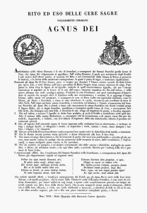 Oggi, nell’antica liturgia Romana, il Papa distribuiva al popolo gli Agnus Dei di cera benedetta mescolata col santo Crisma, e sui quali si imprimeva l’immagine dell’Agnello di Dio. Questa distribuzione è assai antica e si faceva durante la messa, mentre appunto la scuola dei Cantori cantava l’invocazione Agnus Dei prima del bacio di pace che precede la Comunione. Nel secolo XIV la cerimonia ci viene cosi descritta: Durante il canto dell’Agnus Dei il Papa distribuisce gli Agnus Dei di cera ai cardinali e ai prelati, ponendoli nelle loro mitre. Terminato poi il divin Sacrificio, egli va nel triclinio e siede a mensa, durante la quale appare sulla soglia un accolito con un bacile d’argento pieno d’Agnus Dei, che gli dice : Domine, Domine, isti sunt agni novelli qui annuntiaverunt alleluia; modo venerunt ad fontes, repleti sunt claritate, alleluia. Avanzatosi in mezzo alla sala, il chierico ripete il medesimo annunzio; indi fattosi più dappresso al Pontefice, in tono più alto torna a ripetere con ancor maggior insistenza il suo messaggio, deponendo questa volta il bacile sulla mensa papale. Il Papa allora cominciava la distribuzione degli Agnus Dei ai suoi famigliari, ai sacerdoti, ai cappellani, agli accoliti, e ne mandava perfino in dono ai sovrani cattolici.