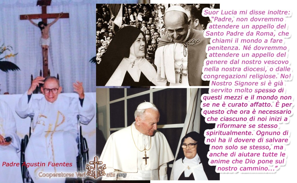 Suor Lucia mi disse inoltre: “Padre, non dovremmo attendere un appello del Santo Padre da Roma, che chiami il mondo a fare penitenza. Né dovremmo attendere un appello del genere dal nostro vescovo nella nostra diocesi, o dalle congregazioni religiose. No! Nostro Signore si è già servito molto spesso di questi mezzi e il mondo non se ne è curato affatto. È per questo che ora è necessario che ciascuno di noi inizi a riformare se stesso spiritualmente. Ognuno di noi ha il dovere di salvare non solo se stesso, ma anche di aiutare tutte le anime che Dio pone sul nostro cammino. Il diavolo fa tutto quanto è in suo potere per distrarci e per allontanarci dalla preghiera; ci salveremo insieme o saremo dannati insieme.”
