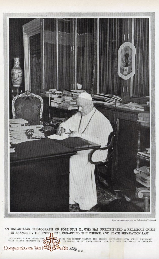 Le scienze ecclesiastiche che egli aveva voluto rinnovare mediante il tomismo, si incamminavano per vie opposte; l’azione sociale dei cattolici che egli aveva definito con chiarezza veniva, poco alla volta, sostituita da una falsa democrazia liberale; il laicismo invadeva ogni campo e minacciava di oscurare completamente negli spiriti i principi che reggono le società e stabiliscono i loro rapporti con la Chiesa.