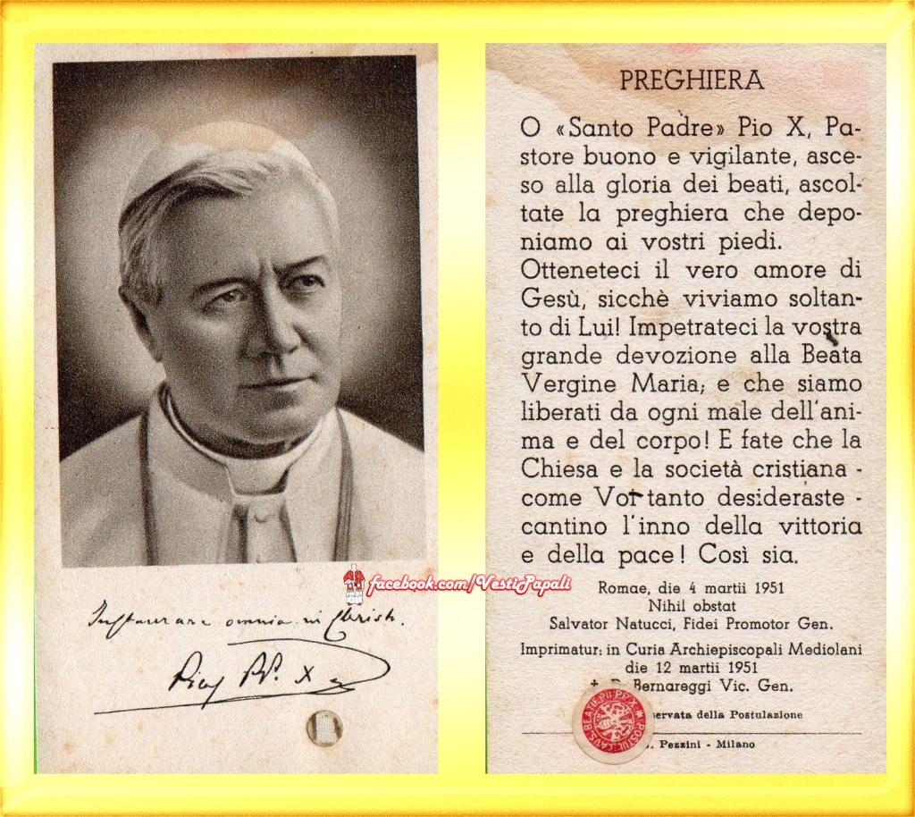 Sì o san Pio X, gloria del sacerdozio, splendore e decoro del popolo cristiano. Tu, in cui l’umiltà parve affratellarsi con la grandezza, l’austerità con la mansuetudine, la semplice pietà con la profonda dottrina; Tu, pontefice della Eucarestia e del catechismo della fede integra e della fermezza impavida; volgi il tuo sguardo verso la Chiesa santa, che tu tanto amasti e alla quale dedicasti il meglio dei tesori che, con mano prodiga, la divina Bontà aveva deposto nell’animo tuo; ottienile la incolumità e la costanza, in mezzo alle difficoltà e alle persecuzioni dei nostri tempi; sorreggi questa povera umanità, i cui dolori così profondamente Ti afflissero, che arrestarono alla fine i palpiti del Tuo gran cuore; fa’ che in questo mondo agitato trionfi quella pace, che deve essere armonia fra le nazioni, accorda fraterna e sincera collaborazione tra le classi sociali, amore e carità tra gli uomini, affinché in tal guisa quelle ansie, che consumarono la Tua vita apostolica, divengano, grazie alla Tua intercessione, una felice realtà, a gloria del Signore nostro Gesù Cristo, che col Padre e lo Spirito Santo vive e regna nei secoli dei secoli. Così sia! [2].