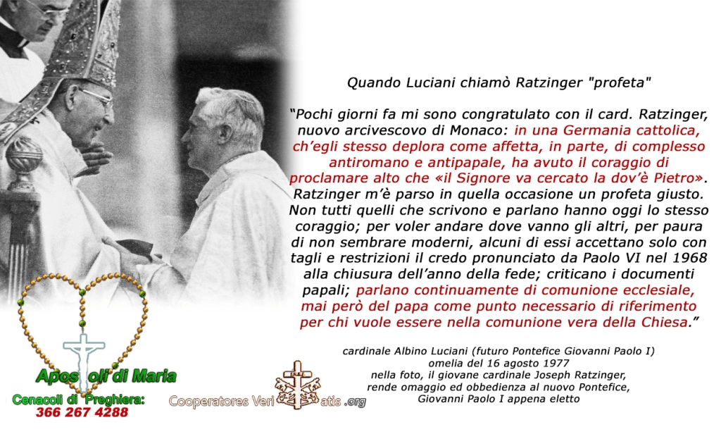Nel processo di canonizzazione (Luciani sarà beatificato il 4 settembre 2022), c’è una importante testimonianza dell’interrogatorio di Benedetto XVI, svelata nel libro “Il postino di Dio” (edizioni Ares) di Nicola Scopelliti.
