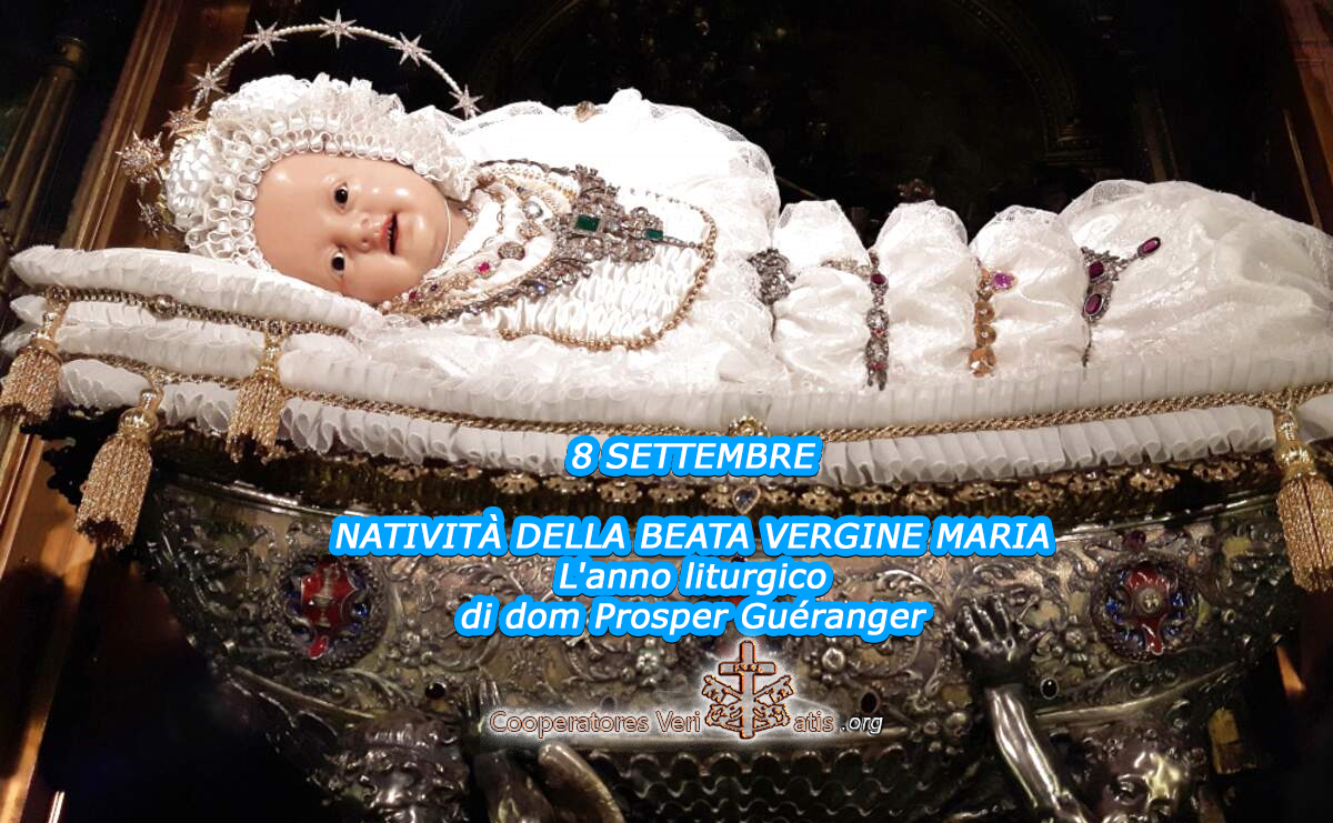 La Chiesa ci invita alla gioia perché Maria è la Madre della divina grazia e, nel pensiero divino, già la Madre del Verbo incarnato. Le parole grazia e gioia hanno in greco una stessa radice, vanno sempre a fianco e si richiamano a vicenda: Maria, essendo piena di grazia, è anche piena di gioia per sé e per noi. La Liturgia ci mostra in questa graziosa bambina appena nata la Madre di Gesù, tanto Maria è inseparabile dal Figlio, che è nata solo per lui, per essere sua Madre e per divenire madre nostra, dandoci la vera vita, la vita della grazia. Tutte le preghiere della Messa acclamano la maternità della Vergine Maria quasi per dire che la Chiesa non può separare la sua nascita da quella dell’Emmanuele.