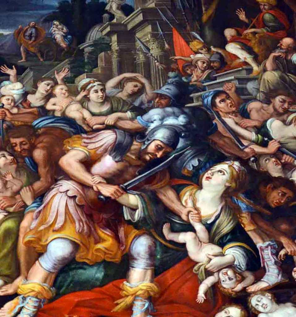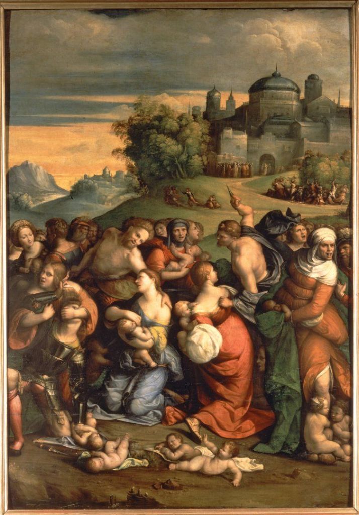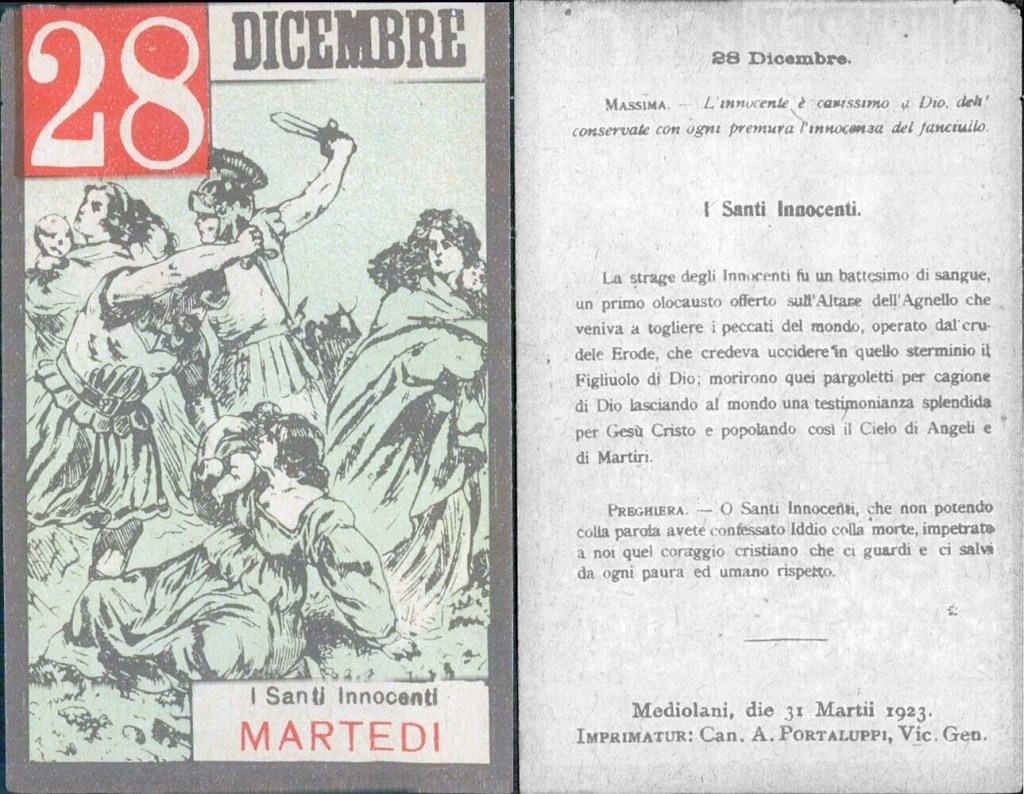 ”Tuttavia, in questo gaudio del cielo e della terra, la Santa Romana Chiesa non perde di vista la desolazione delle madri che videro così strappati dal seno, e immolati dalla spada dei soldati, i diletti pegni della loro tenerezza. Ha raccolto il grido di Rachele, e non cerca di consolarla se non compatendo la sua afflizione. Per onorare quel materno dolore, consente a sospendere oggi una parte delle manifestazioni della gioia che inonda il suo cuore nell’Ottava di Cristo nato. Non osa rivestire nei suoi paramenti sacri il colore della porpora dei Martiri, per non richiamare troppo vivamente quel sangue che zampilla fino sul seno delle madri; si proibisce anche il colore bianco che denota la letizia e non si addice a così pungente dolore. Riveste il colore viola, colore di lutto e di rimpianti. Oggi, anzi, se la festa non cade di domenica, giunge fino a sospendere il canto del Gloria in excelsis, che pure le è tanto caro in questi giorni in cui gli Angeli l’hanno intonato sulla terra; rinuncia al festoso Alleluia nella celebrazione del Sacrificio e infine si mostra, come sempre, ispirata da quella delicatezza sublime e cristiana di cui la sacra Liturgia è mirabile scuola.