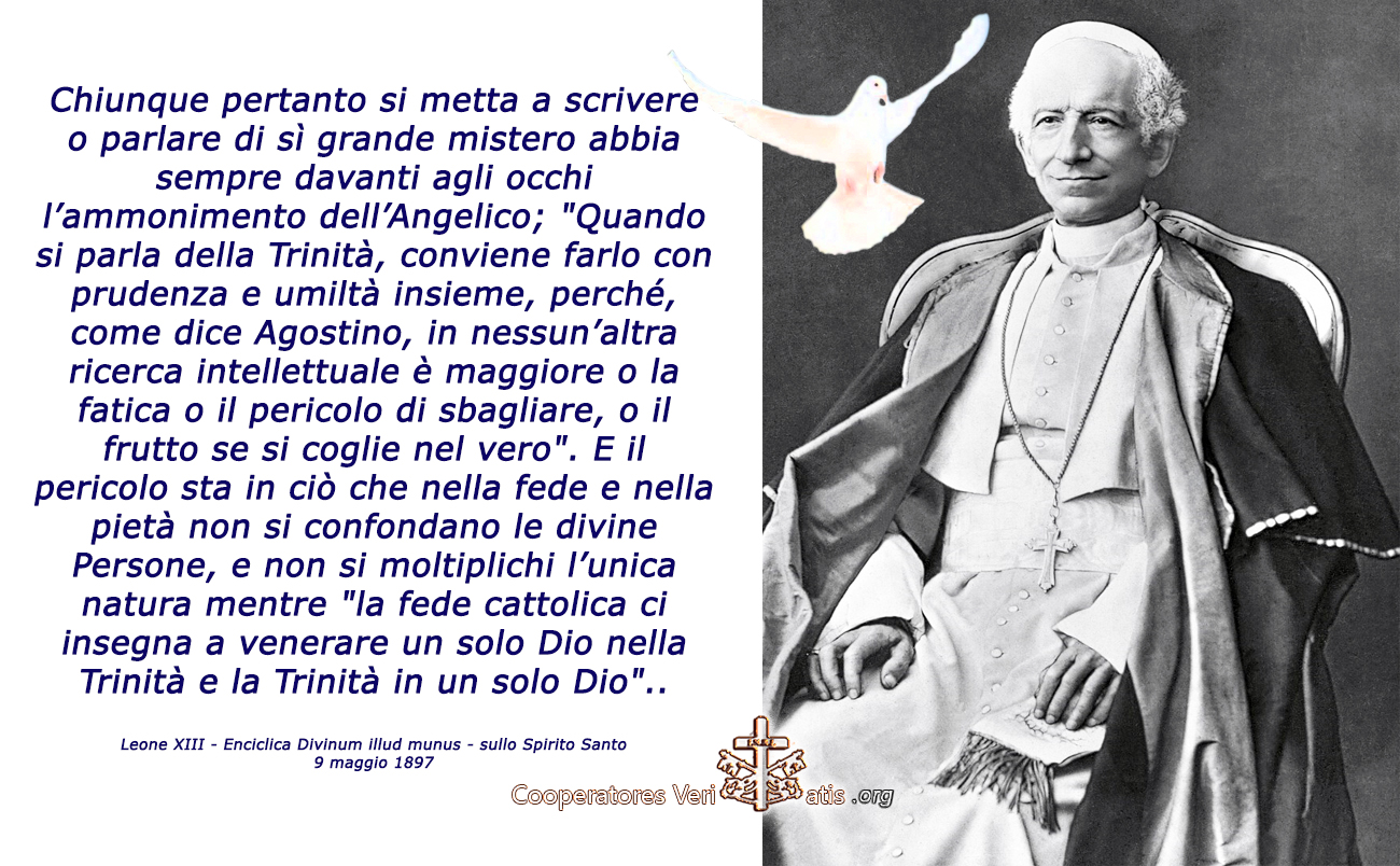 Questa enciclica, di cui TUTTI i carismatici ne ignorano l’esistenza, guarda “il caso” insegna proprio la dottrina sulla Santissima Trinità e l’azione che è propria allo Spirito Santo. Leone XIII che ben conosceva l’avanzarsi di nuove forme eretiche su questo prezioso dogma, chiarisce la posizione del Vangelo e della Chiesa, affermando anche perché Essa non abbia mai dato luogo ad una “Festa particolare dedicata al Padre” così come molti gruppi strani già richiedevano, non ritenendolo dottrinalmente corretto. Invitiamo i “carismatici” e che tal vogliano dirsi, di studiarsi umilmente l’argomento, accogliendo il severo monito di Leone XIII anche laddove dice: