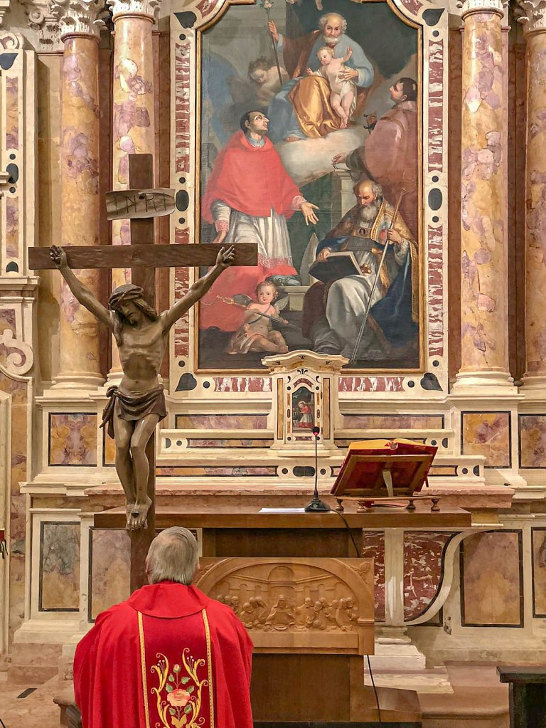 A cui ogni volta risponde il primo coro con il Trishagion greco (da hagios, santo, cioè “il Tre volte Santo”, onore e gloria al Dio Uno e Trino) a cui replica l’altro coro con la traduzione latina.