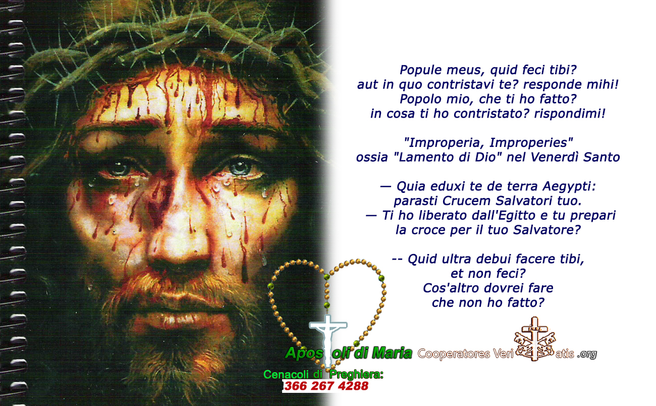 Questa sequenza, litanica possiamo dire, si chiama “Improperia, Improperies” ossia “Lamento di Dio“, ed è plurale Improperium = rimprovero, cioè il rimprovero amorevole e misericordioso di Gesù non contro le persone che lo hanno messo a morte, ma contro la perspicace e superba resistenza a voler continuare a non rispondere a quelle domande scomode che Dio pone a chi ha deciso di metterlo a morte, di consegnarlo alla croce e così nel tempo, anche noi quando, restando reprobi nel peccare, torniamo a crocifiggere nuovamente Gesù.