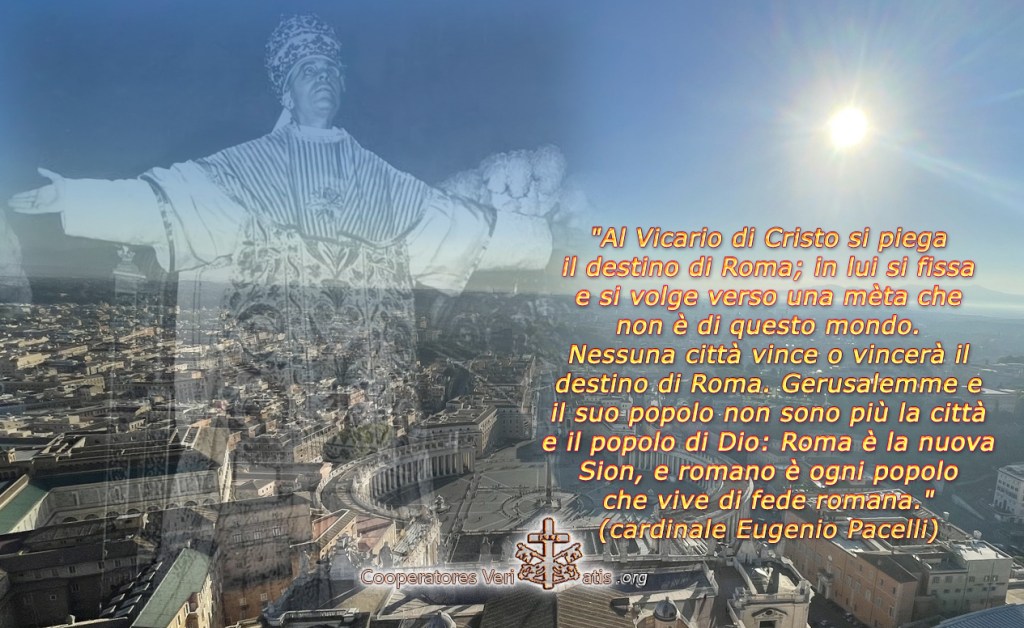“Al Vicario di Cristo si piega il destino di Roma; in lui si fissa e si volge verso una mèta che non è di questo mondo. Nessuna città vince o vincerà il destino di Roma. Gerusalemme e il suo popolo non sono più la città e il popolo di Dio: Roma è la nuova Sion, e romano è ogni popolo che vive di fede romana.” (cardinale Eugenio Pacelli)
