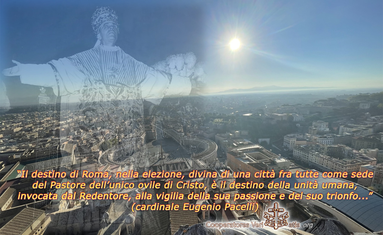 “Al Vicario di Cristo si piega il destino di Roma; in lui si fissa e si volge verso una mèta che non è di questo mondo. Nessuna città vince o vincerà il destino di Roma. Gerusalemme e il suo popolo non sono più la città e il popolo di Dio: Roma è la nuova Sion, e romano è ogni popolo che vive di fede romana.” (cardinale Eugenio Pacelli)