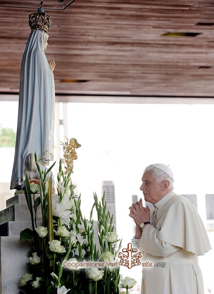 Con la famiglia umana pronta a sacrificare i suoi legami più santi sull’altare di gretti egoismi di nazione, razza, ideologia, gruppo, individuo, è venuta dal Cielo la nostra Madre benedetta offrendosi per trapiantare nel cuore di quanti le si affidano l’Amore di Dio che arde nel suo. In quel tempo erano soltanto tre, il cui esempio di vita si è diffuso e moltiplicato in gruppi innumerevoli per l’intera superficie della terra, in particolare al passaggio della Vergine Pellegrina, i quali si sono dedicati alla causa della solidarietà fraterna. Possano questi (sette) anni (che ci separano dal centenario delle Apparizioni) affrettare il preannunciato trionfo del Cuore Immacolato di Maria a gloria della Santissima Trinità.” (Benedetto XVI a Fatima 13 maggio 2010)