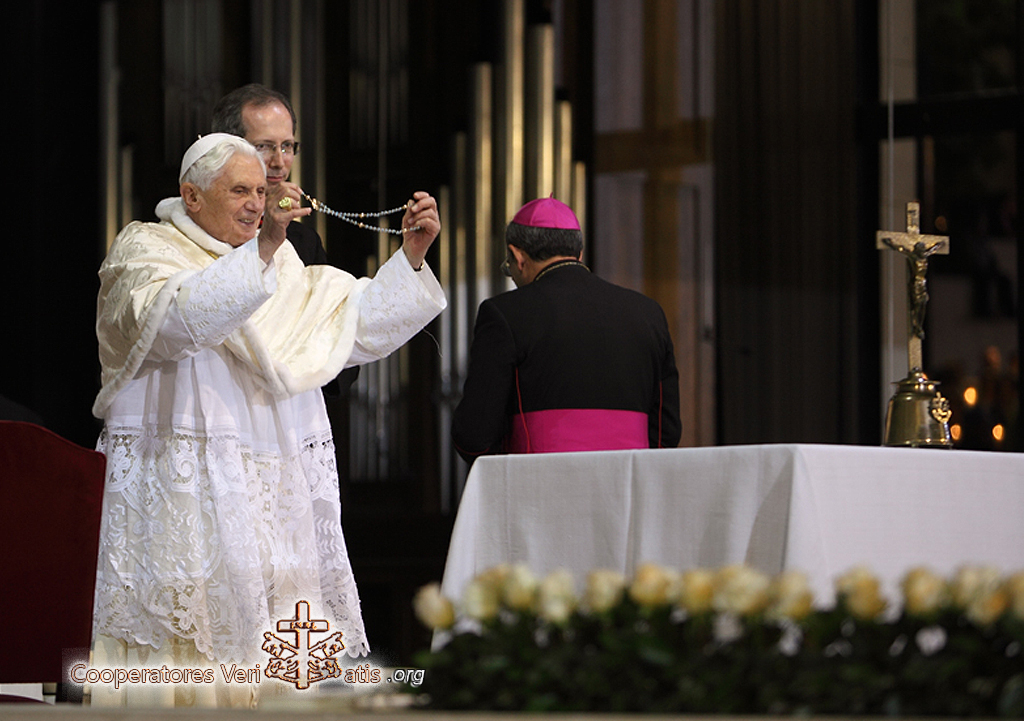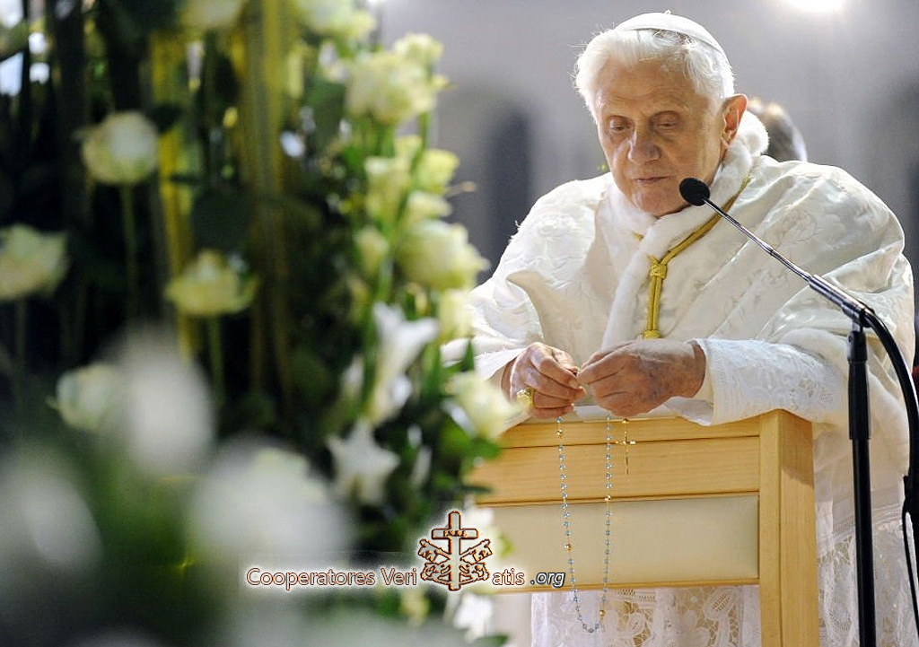 La recita del rosario ci consente di fissare il nostro sguardo e il nostro cuore in Gesù, come faceva sua Madre, modello insuperabile della contemplazione del Figlio. Nel meditare i misteri gaudiosi, luminosi, dolorosi e gloriosi mentre recitiamo le «Ave Maria», contempliamo l’intero mistero di Gesù, dall’Incarnazione fino alla Croce e alla gloria della Risurrezione; contempliamo l’intima partecipazione di Maria a questo mistero e la nostra vita in Cristo oggi, che pure si presenta tessuta di momenti di gioia e di dolore, di ombre e di luce, di trepidazione e di speranza.