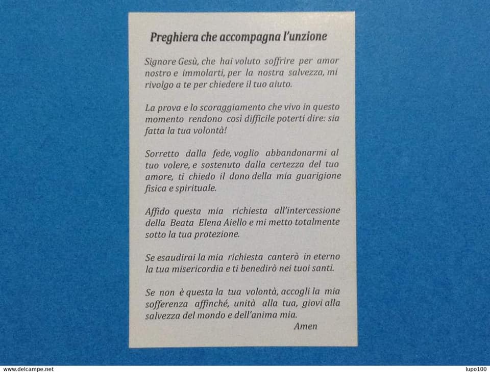 +Accogli, Dio Onnipotente e misericordioso, l’umile e fiduciosa preghiera che noi Ti rivolgiamo per l’intercessione della Beata Madre Elena Aiello Tua serva fedele, segnata nel corpo e nello spirito, dalle sofferenze di Cristo Crocifisso.