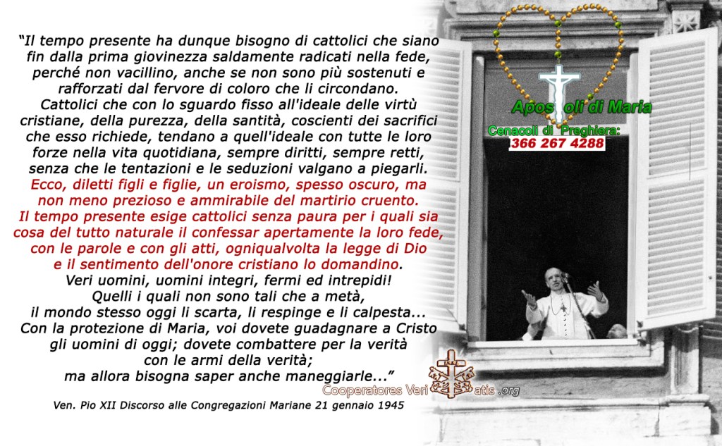 Il tempo presente ha dunque bisogno di cattolici che siano fin dalla prima giovinezza saldamente radicati nella fede, perché non vacillino, anche se non sono più sostenuti e rafforzati dal fervore di coloro che li circondano. Cattolici che con lo sguardo fisso all’ideale delle virtù cristiane, della purezza, della santità, coscienti dei sacrifici che esso richiede, tendano a quell’ideale con tutte le loro forze nella vita quotidiana, sempre diritti, sempre retti, senza che le tentazioni e le seduzioni valgano a piegarli. Ecco, diletti figli e figlie, un eroismo, spesso oscuro, ma non meno prezioso e ammirabile del martirio cruento.