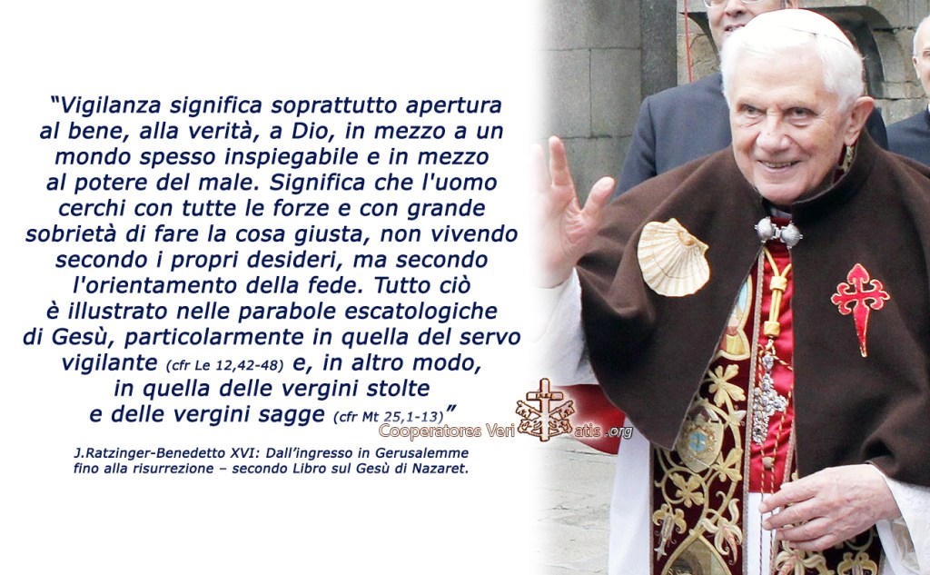 Vigilanza significa soprattutto apertura al bene, alla verità, a Dio, in mezzo a un mondo spesso inspiegabile e in mezzo al potere del male. Significa che l’uomo cerchi con tutte le forze e con grande sobrietà di fare la cosa giusta, non vivendo secondo i propri desideri, ma secondo l’orientamento della fede. Tutto ciò è illustrato nelle parabole escatologiche di Gesù, particolarmente in quella del servo vigilante (cfr Le 12,42-48) e, in altro modo, in quella delle vergini stolte e delle vergini sagge (cfr Mt 25,1-13). .