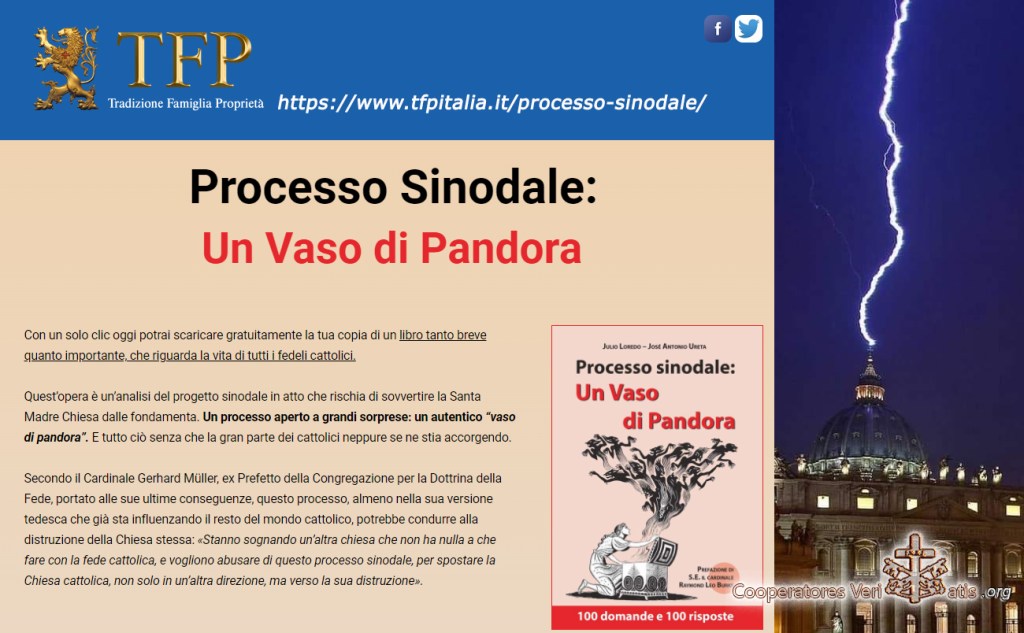 Processo sinodale: un vaso di Pandora, attraverso una serie di 100 domande e risposte, getta la luce di Cristo, la verità di Cristo, sul momento presente, alquanto preoccupante, della Chiesa. Lo studio delle domande e delle risposte aiuterà i cattolici sinceri ad essere “collaboratori della verità” di Cristo (3Gv 8), come tutti i membri della Chiesa sono chiamati ad essere, e quindi a diventare agenti del rinnovamento della Chiesa nel nostro tempo, fedeli alla Tradizione apostolica…”