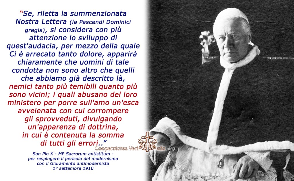 Il 1° settembre 1910 san Pio X con il Motu Proprio “Sacrorum antistitum” ribadisce la condanna del Modernismo e dei loro diffusori definendoli: “una genia perniciosissima di persone” e, ricordando i punti fondamentali della Pascendi Dominici gregis – CLICCA QUI – sottolinea i mezzi per estirpare le loro eresie. In questo MP vi unisce l’obbligo, allegando il documento, del “Giuramento Antimodernista” (poi abolito da Paolo VI nel 1966).