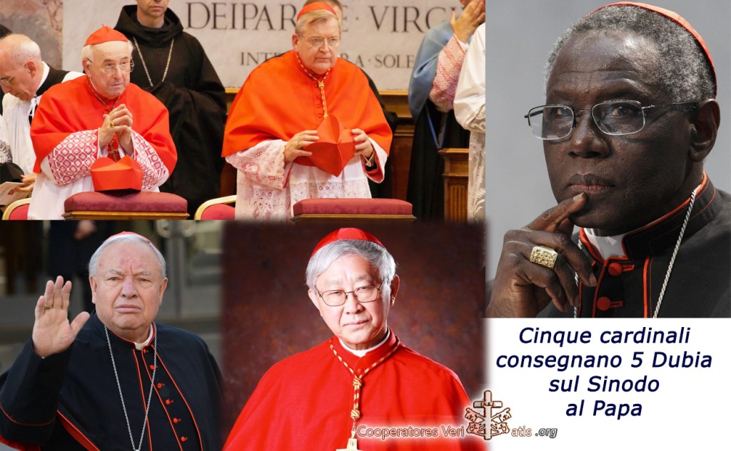 Noi, membri del Sacro Collegio Cardinalizio, avendo presente il dovere di tutti i fedeli “di manifestare ai sacri Pastori il loro pensiero su ciò che riguarda il bene della Chiesa” (can. 212 § 3) e, soprattutto, avendo presente la responsabilità dei Cardinali che “assistono il Romano Pontefice … come singoli … nella cura soprattutto quotidiana della Chiesa universale” (can. 349), considerate varie dichiarazioni di alcuni alti Prelati inerenti alla celebrazione del prossimo Sinodo dei Vescovi, palesemente contrarie alla costante dottrina e disciplina della Chiesa, e che hanno generato e continuano a generare tra i fedeli e in altre persone di buona volontà grande confusione e la caduta in errore, abbiamo manifestato la nostra profondissima preoccupazione al Romano Pontefice. Ricorrendo alla provata prassi della sottomissione di dubia [domande] ad un superiore per fornirgli l’occasione di chiarire, attraverso i suoi responsa [risposte], la dottrina e la disciplina della Chiesa, con la nostra lettera del 10 luglio 2023 abbiamo sottomesso a Papa Francesco cinque dubia, di cui è allegata una copia. Papa Francesco ci ha risposto con lettera dell’11 luglio 2023.