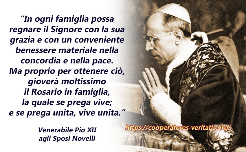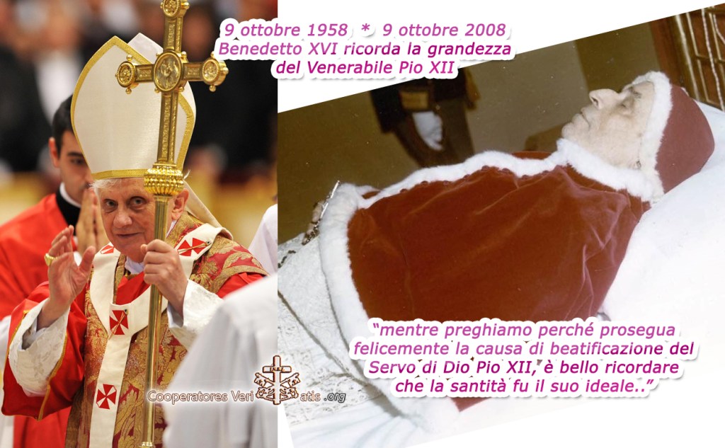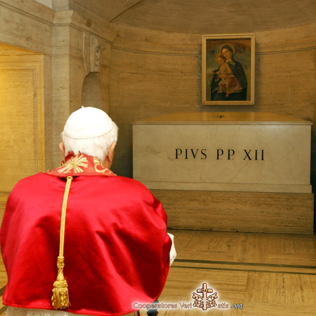 “Miserere mei Deus, secundum magnam misericordiam tuam”: con questa invocazione del Salmo 50/51 Pio XII iniziava il suo testamento. E continuava: “Queste parole, che, conscio di essere immeritevole e impari, pronunciai nel momento in cui diedi, tremando, la mia accettazione alla elezione a Sommo Pontefice, con tanto maggior fondamento le ripeto ora”. Mancavano allora due anni alla sua morte. Abbandonarsi nelle mani misericordiose di Dio: fu questo l’atteggiamento che coltivò costantemente questo mio venerato Predecessore, ultimo dei Papi nati a Roma ed appartenente ad una famiglia legata da molti anni alla Santa Sede. In Germania, dove svolse il compito di Nunzio Apostolico, prima a Monaco di Baviera e poi a Berlino sino al 1929, lasciò dietro di sé una grata memoria, soprattutto per aver collaborato con Benedetto XV al tentativo di fermare “l’inutile strage” della Grande Guerra, e per aver colto fin dal suo sorgere il pericolo costituito dalla mostruosa ideologia nazionalsocialista con la sua perniciosa radice antisemita e anticattolica. Creato Cardinale nel dicembre 1929, e divenuto poco dopo Segretario di Stato, per nove anni fu fedele collaboratore di Pio XI, in un’epoca contrassegnata dai totalitarismi: quello fascista, quello nazista e quello comunista sovietico, condannati rispettivamente dalle Encicliche Non abbiamo bisogno, Mit Brennender Sorge e Divini Redemptoris.