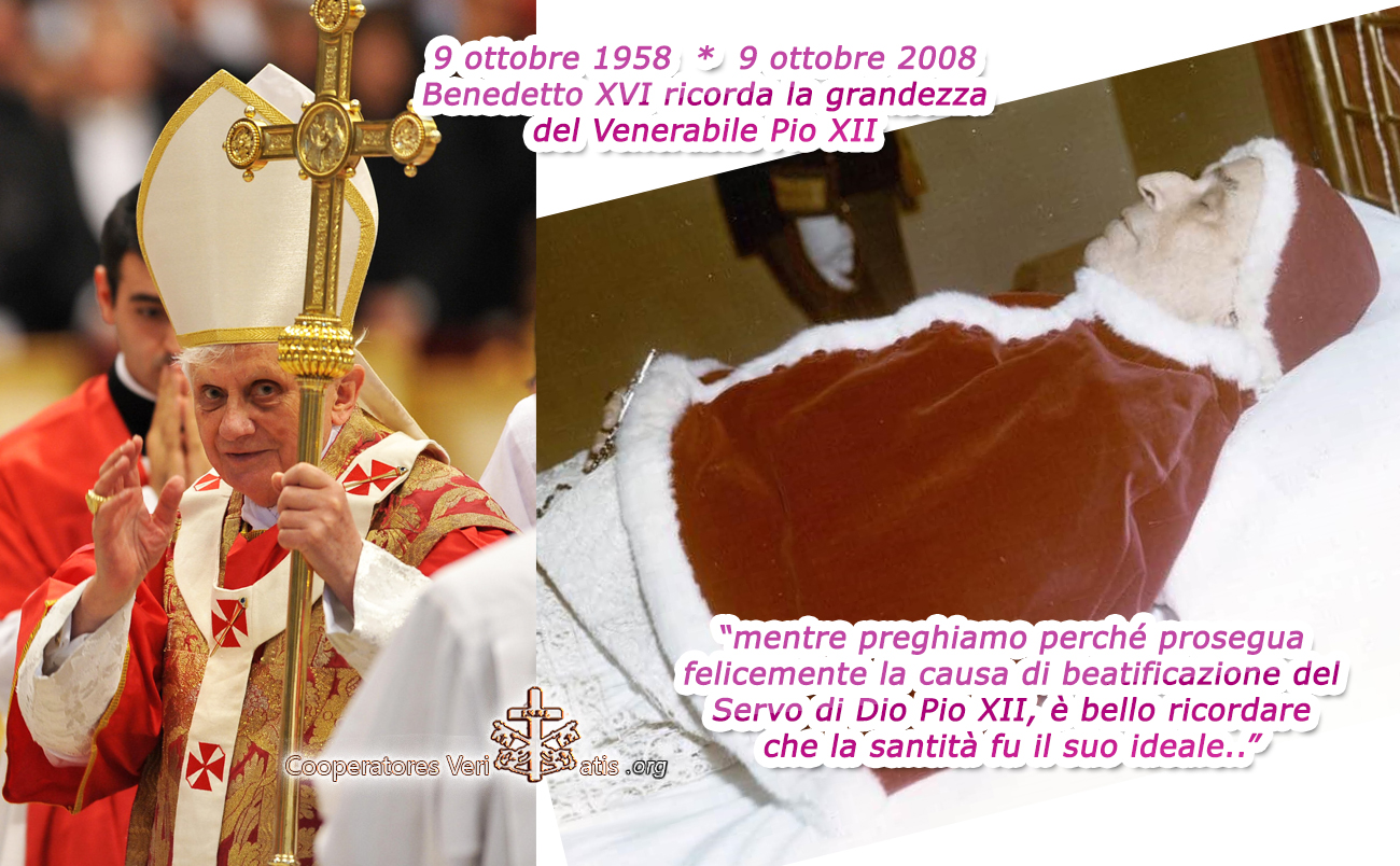 “Miserere mei Deus, secundum magnam misericordiam tuam”: con questa invocazione del Salmo 50/51 Pio XII iniziava il suo testamento. E continuava: “Queste parole, che, conscio di essere immeritevole e impari, pronunciai nel momento in cui diedi, tremando, la mia accettazione alla elezione a Sommo Pontefice, con tanto maggior fondamento le ripeto ora”. Mancavano allora due anni alla sua morte. Abbandonarsi nelle mani misericordiose di Dio: fu questo l’atteggiamento che coltivò costantemente questo mio venerato Predecessore, ultimo dei Papi nati a Roma ed appartenente ad una famiglia legata da molti anni alla Santa Sede. In Germania, dove svolse il compito di Nunzio Apostolico, prima a Monaco di Baviera e poi a Berlino sino al 1929, lasciò dietro di sé una grata memoria, soprattutto per aver collaborato con Benedetto XV al tentativo di fermare “l’inutile strage” della Grande Guerra, e per aver colto fin dal suo sorgere il pericolo costituito dalla mostruosa ideologia nazionalsocialista con la sua perniciosa radice antisemita e anticattolica. Creato Cardinale nel dicembre 1929, e divenuto poco dopo Segretario di Stato, per nove anni fu fedele collaboratore di Pio XI, in un’epoca contrassegnata dai totalitarismi: quello fascista, quello nazista e quello comunista sovietico, condannati rispettivamente dalle Encicliche Non abbiamo bisogno, Mit Brennender Sorge e Divini Redemptoris.