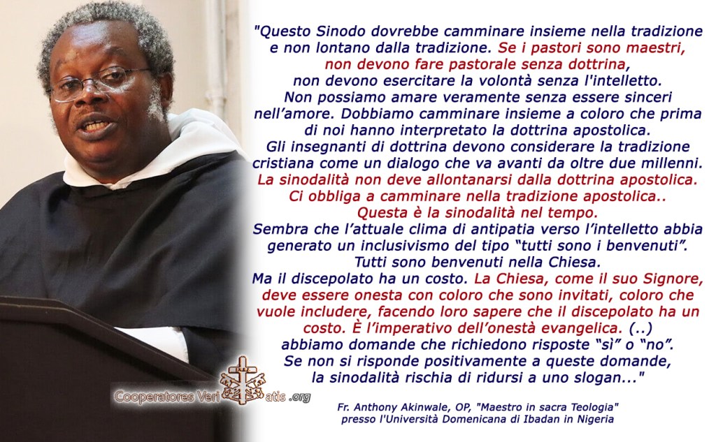 “Questo Sinodo dovrebbe camminare insieme nella tradizione e non lontano dalla tradizione. Se i pastori sono maestri, non devono fare pastorale senza dottrina, non devono esercitare la volontà senza l’intelletto. Non possiamo amare veramente senza essere sinceri nell’amore. Dobbiamo camminare insieme a coloro che prima di noi hanno interpretato la dottrina apostolica. Gli insegnanti di dottrina devono considerare la tradizione cristiana come un dialogo che va avanti da oltre due millenni. La sinodalità non deve allontanarsi dalla dottrina apostolica. Ci obbliga a camminare nella tradizione apostolica. Questa è la sinodalità nel tempo. Sembra che l’attuale clima di antipatia verso l’intelletto abbia generato un inclusivismo del tipo “tutti sono i benvenuti”. Tutti sono benvenuti nella Chiesa. Ma il discepolato ha un costo. La Chiesa, come il suo Signore, deve essere onesta con coloro che sono invitati, coloro che vuole includere, facendo loro sapere che il discepolato ha un costo. È l’imperativo dell’onestà evangelica. (..) abbiamo domande che richiedono risposte “sì” o “no”. Se non si risponde positivamente a queste domande, la sinodalità rischia di ridursi a uno slogan…” (Fr. Anthony Akinwale, OP, “Maestro in sacra Teologia” presso l’Università Domenicana di Ibadan in Nigeria)