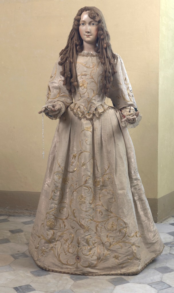 La prima “Madonna” (che significa “Mia Signora“) vestita, risale al 1562 in una chiesa di Venezia e per la quale furono confezionati ben 61 abiti completi con stoffe pregiatissime, ricami e preziosi.