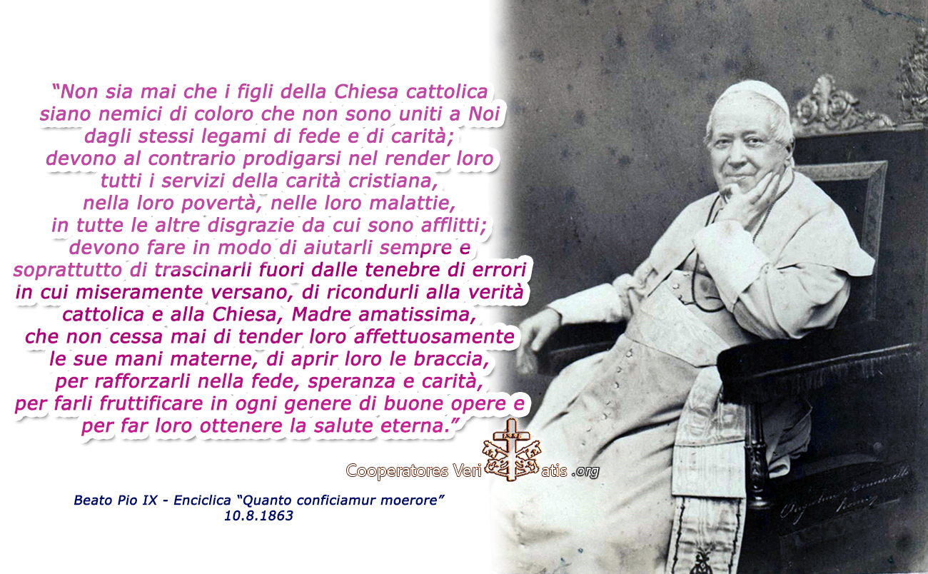 La meravigliosa enciclica del Beato Pontefice Pio IX “Quanto conficiamur moerore”, anti-liberale, contro certo liberalismo entrato nella Chiesa: “di Emancipatrice del Clero Italiano (così comunemente chiamate) e altre ancora, animate dallo stesso spirito perverso” – afferma il Pontefice, fondamentale anche per capire il vero senso del dogma cattolico nella famosa frase: “Extra Ecclesiam nulla salus“.