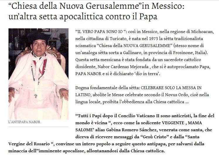 Morto l’eretico e scismatico Nabor nel 2008, all’interno della sètta, che intanto costruì il proprio grandioso tempio detto La Ermita, coi soldi del governo filo massone ed ateo e dei seguaci, ci furono molti dissidi e lotte: i poteri della sètta passarono ad un nuovo antiPapa e ad un nuovo “veggente”, che prese il nome di San Martino di Tours… insomma, un altro che si autoproclama ‘santo e veggente’… Il fanatismo diviene sempre più violento: nel 2012 viene dato l’ordine di DISTRUGGERE a colpi di piccone e fuoco TUTTE LE CHIESE CATTOLICHE sorte dopo il Concilio Vaticano II, ed anche le scuole pubbliche, perchè l’unica scuola e l’unica chiesa ammesse sarebbero state solo all’interno della setta della Nuova Gerusalemme con l’unica Messa in latino, a cui bisogna partecipare tre volte al giorno e l’unica lettura permessa nella sètta è quella del libro dei “messaggi ” ricevuti da Mama Salomè e dai successivi ‘veggenti’ approvati dalla gerarchia della sétta….