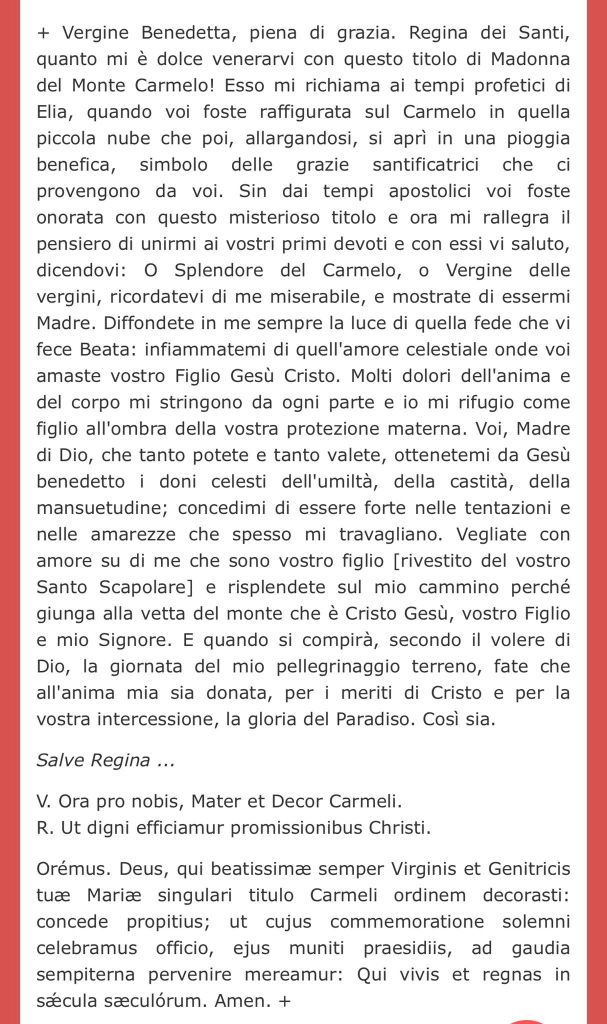 🙏O Maria, Madre e decoro del Carmelo, a te consacro oggi la mia vita, quale piccolo tributo di gratitudine per le grazie che attraverso la tua intercessione ho ricevuto da Dio. Tu guardi con particolare benevolenza coloro che devotamente portano il tuo Scapolare: ti supplico perciò di sostenere la mia fragilità con le tue virtù, d’illuminare con la tua sapienza le tenebre della mia mente, e di ridestare in me la fede, la speranza e la carità, perché possa ogni giorno crescere nell’amore di Dio e nella devozione verso di te. Lo Scapolare richiami su di me lo sguardo tuo materno e la tua protezione nella lotta quotidiana, sì che possa restare fedele al Figlio tuo Gesù e a te, evitando il peccato e imitando le tue virtù. Desidero offrire a Dio, per le tue mani, tutto il bene che mi riuscirà di compiere con la tua grazia; la tua bontà mi ottenga il perdono dei peccati e una più sicura fedeltà al Signore. O Madre amabilissima, il tuo amore mi ottenga che un giorno sia concesso a me di mutare il tuo Scapolare con l’eterna veste nuziale e di abitare con te e con i Santi del Carmelo nel regno beato del Figlio tuo che vive e regna per tutti i secoli dei secoli. Amen. Salve Regina….