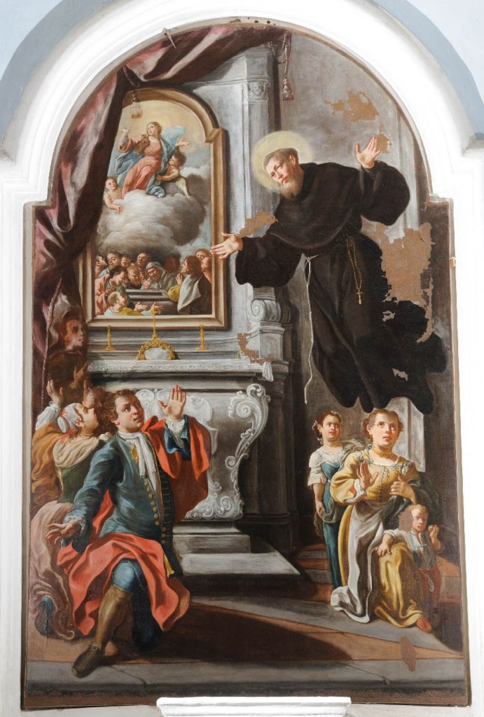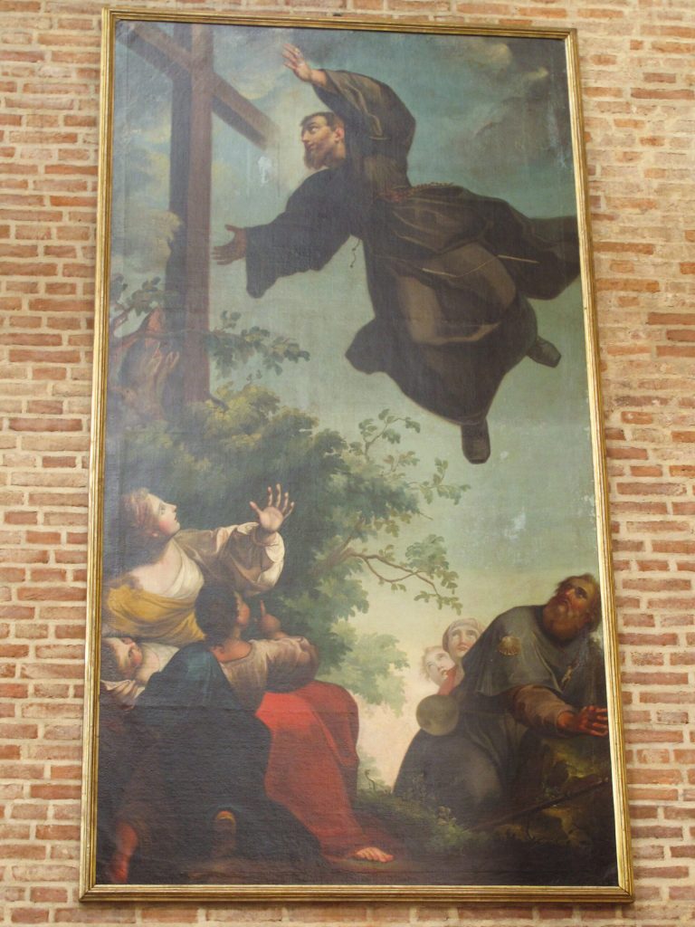Ebbene, San Giuseppe, dopo lunghi anni di peregrinazione (a Napoli, Roma, Assisi, Fossombrone e Pietrarubbia, nelle Marche), giunto in una casa colonica presso Osimo (10 luglio del 1607), volle salire sul terrazzo per ammirare il panorama. Si affacciò al suo sguardo il Santuario di Loreto e – attestano i biografi – San Giuseppe ebbe dapprima una splendida visione: angeli che salivano e scendevano dal cielo, osannando alla Casa di Nazareth, dove la Madonna aveva concepito il Bambino. Poi egli spiccò un volo e andò a posarsi su un mandorlo. Il volo e l’estasi che ne seguirono furono interrotti dal Padre Segretario Generale che, insieme con altri confratelli, era lì presente e comandò al Santo di rientrare in sé. Questo episodio ha ispirato il pittore Ludovico Mazzanti, il quale nel 1754, un anno dopo la Beatificazione del Santo, aveva già terminato la famosa tela, ora conservata nella Basilica del Santo a Osimo. La medesima tela è “volata” a Toronto, in Canada, e, in occasione dell’annuale appuntamento con i giovani di tutto il mondo voluto da Giovanni Paolo II, dal 7 giugno all’11 agosto 2002 è rimasta esposta in una mostra d’arte sul tema “Immagini di salvezza”.