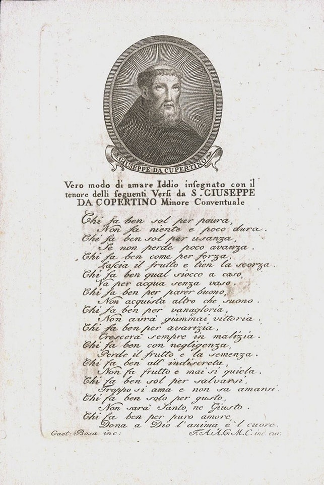 San Giuseppe da Copertino: protettore degli studenti, perché studiava molto; protettore degli aviatori, per il dono singolarissimo di staccarsi da terra col corpo oltre che con lo spirito. Non fu certo un uomo colto, ma ha scritto alcune poesie, un po’ zoppicanti rispetto alle classiche regole della metrica e degli artifici letterari, ma schiette e profonde. Racconta padre Roberto Nuti, suo primo biografo e suo contemporaneo, che Giuseppe da Copertino, per dare sfogo con maggiore esaltazione al suo amore verso Dio, con grande spirito di devozione, ma anche con semplicità, cantava alcune canzoni che egli stesso componeva, specialmente nelle grandi festività liturgiche.