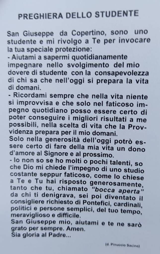 San Giuseppe da Copertino, patrono degli studenti, nelle fatiche dello studio tu hai sperimentato l’assistenza e la protezione che la Madre di Dio concede a coloro che si impegnano con cuore sincero. Ispira agli studenti il tuo stesso desiderio di acquistare la vera sapienza che viene da Dio ed ottieni loro la forza delle perseveranza perchè non si scoraggino nelle difficoltà e comprendano l’importanza di mettere a frutto i propri doni e le capacità acquisite con lo studio per edificare la civiltà dell’amore.