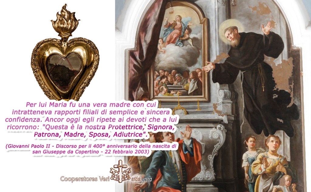 - Per lui Maria fu una vera madre con cui intratteneva rapporti filiali di semplice e sincera confidenza. Ancor oggi egli ripete ai devoti che a lui ricorrono: “Questa è la nostra Protettrice, Signora, Patrona, Madre, Sposa, Adiutrice“. (Giovanni Paolo II – Discorso per il 400° anniversario della nascita di san Giuseppe da Copertino – 22 febbraio 2003)