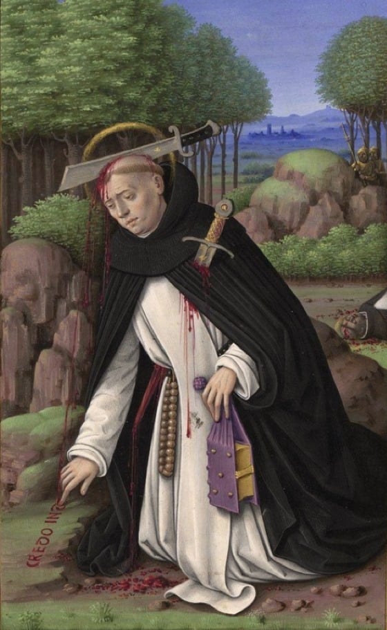 - “Guarda anche Pietro vergine e martire che con il suo sangue portò la luce fra le tenebre di tante eresie: egli odiò l’eresia tanto da essere pronto a lasciarvi la vita. E mentre visse, sua cura continua fu quella di pregare, predicare, disputare con gli eretici e confessare, annunziando la verità e propagando la fede senza alcun timore. E non solo durante la sua vita, ma anche in punto di morte; onde, mentre stava per morire, venendogli meno la voce e mancandogli l’inchiostro, intinse il dito nel proprio sangue: ma non ha carta, questo glorioso martire, e perciò si china e scrive in terra confessando la sua fede, cioè il “Credo in Deum”. Il suo cuore ardeva nella fornace della mia carità, e perciò non rallentò il passo voltando il capo indietro quando capì che doveva morire – prima che morisse, infatti, Io gli rivelai la sua fine – ma, come vero cavaliere privo d’ogni timor servile, uscì allo scoperto, sul campo di battaglia”.