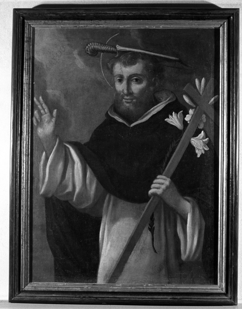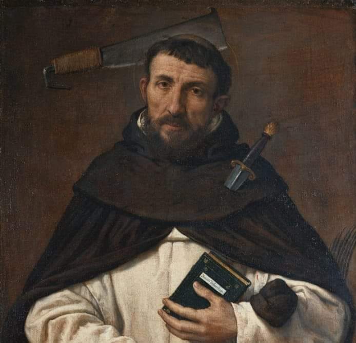 E’ raffigurato con la tonaca domenicana, con la palma del martirio, con la ferita sanguinante dalla fronte al capo, oppure con una roncola che penetra nel cranio, con il pugnale infitto al petto o ai fianchi, secondo l’estro dell’artista. E’ patrono dei catechisti e dei teologi.