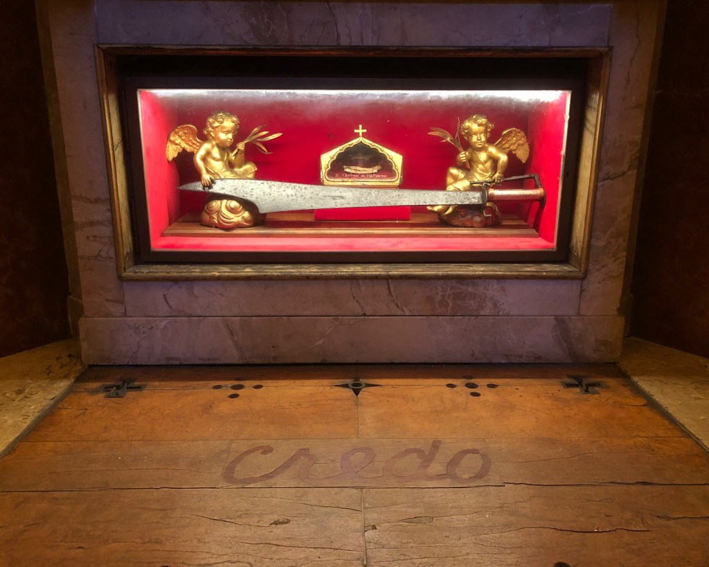 Pietro se ne accorse e, munito di un’Ostia consacrata, riuscì a scacciare il temibile occupante. E’ una bella immagine che ovviamente traduce a livello divulgativo la lotta per affermare il dogma della Maternità divina di Maria, la sua Perpetua Verginità, l’essere “Madre di Dio”. I catari sostenevano infatti che Maria non partorì il Figlio, ma che lo Spirito Santo la fecondò dall’orecchio e il Bambino si materializzò accanto a lei al momento della nascita.