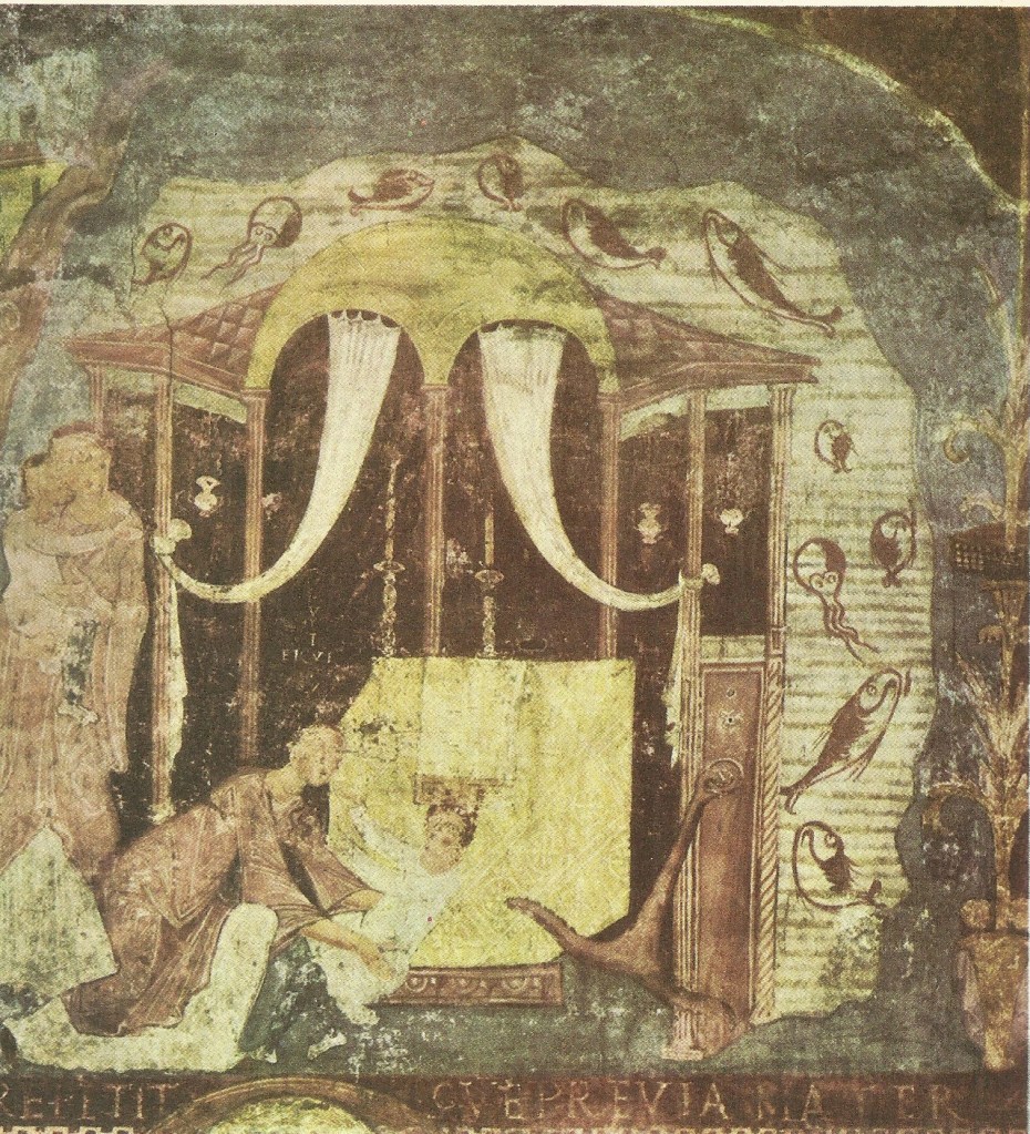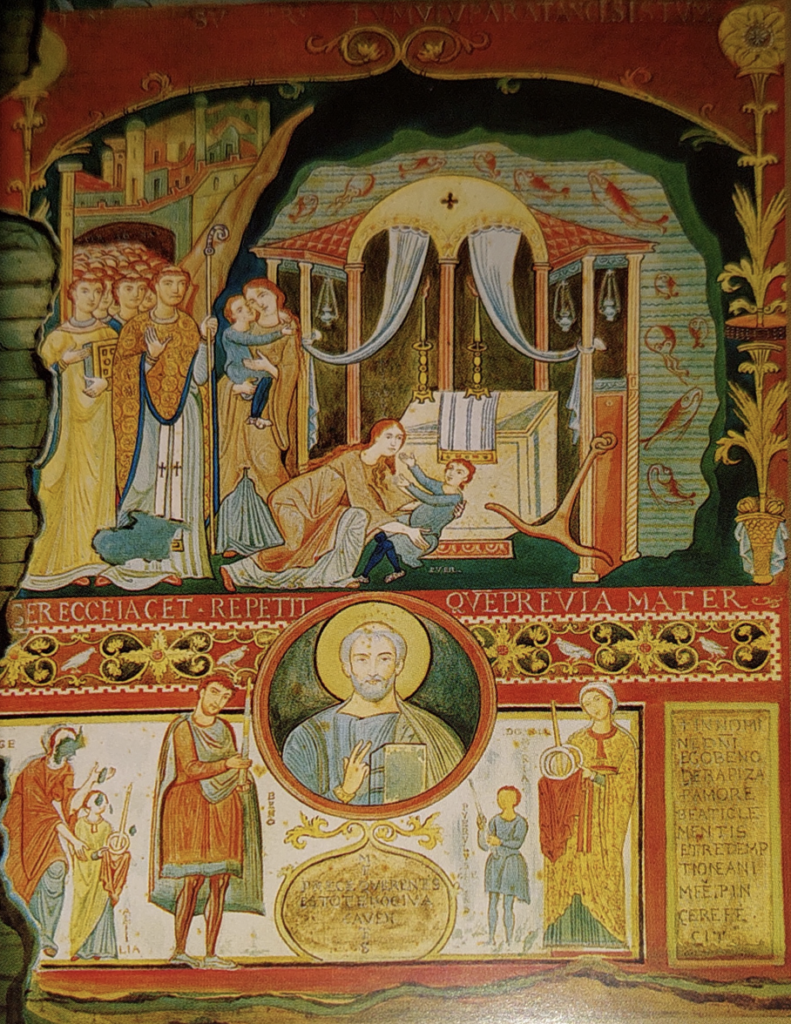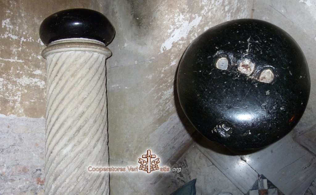 Una volta varcata la soglia (con il suo portale ligneo originale di più di 1500 anni fa), girate subito a sinistra. Lì vedrete una piccola colonnina tortile con una strana e tondeggiante pietra nera. Cosa è? Il nome ufficiale è Lapis Diaboli, la pietra del Diavolo. Eccone la storia: ancora oggi vicino alla basilica sorge il complesso dei domenicani che, sin dal ’200 e per volere di Papa Onorio III, gestiscono l’area e la basilica. I domenicani sono i protagonisti dell’origine della Lapis Diaboli o, meglio ancora, ad essere il fulcro di tutta la storia è il fondatore dell’ordine religioso: Domenico di Guzman. E’ proprio qui, nel chiostro ancora visibile attraverso delle inferriate ed un foro sul muro posto davanti l’ingresso della basilica, che si può vedere quell’arancio che, secondo la tradizione, San Domenico avrebbe portato direttamente dalla Spagna, suo Paese natale. Ed è proprio qui, in questo chiostro, che il santo amava ritirarsi in preghiera.